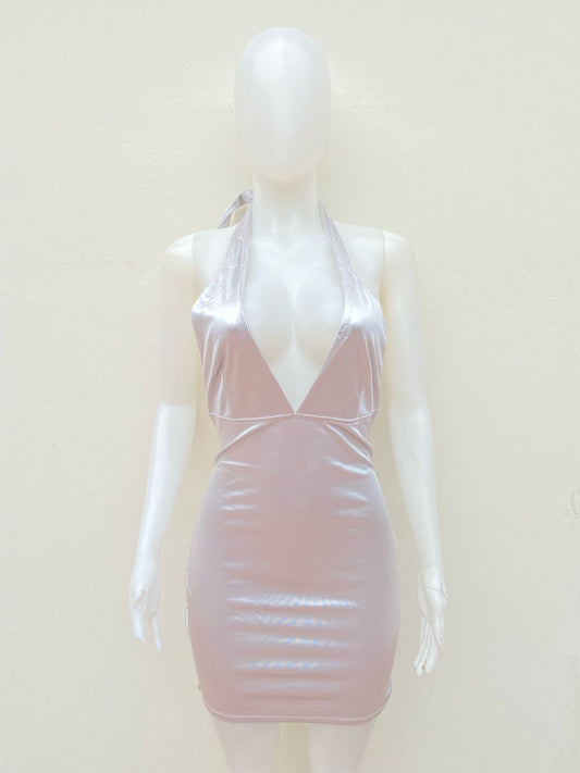 Vestido Fashion Nova original morado con estampado de bolitas.