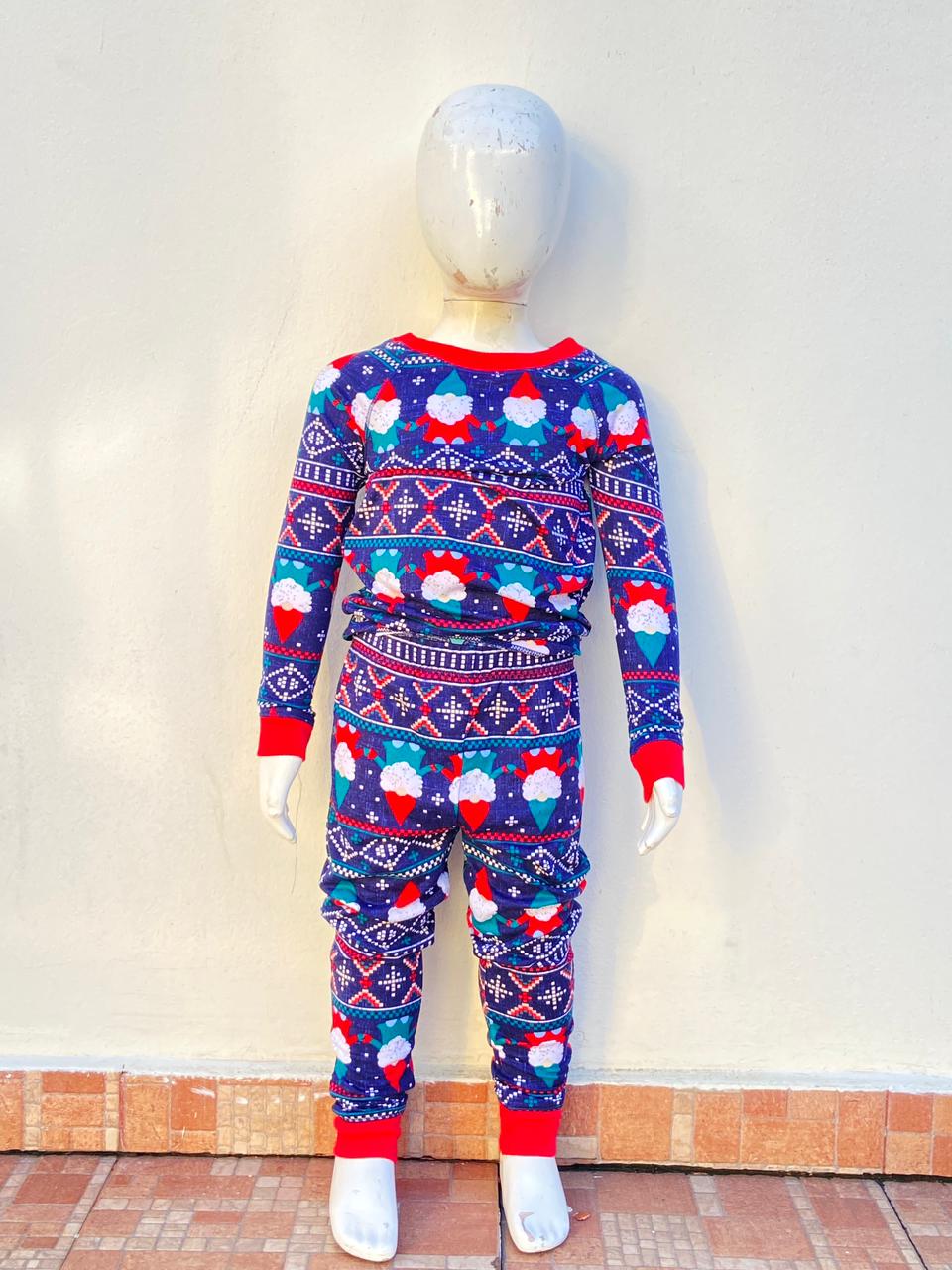 Conjunto/Pijama Navidad azul oscuro, mangas largas, con estampados de cuadritos y muñequitos de santa claus.