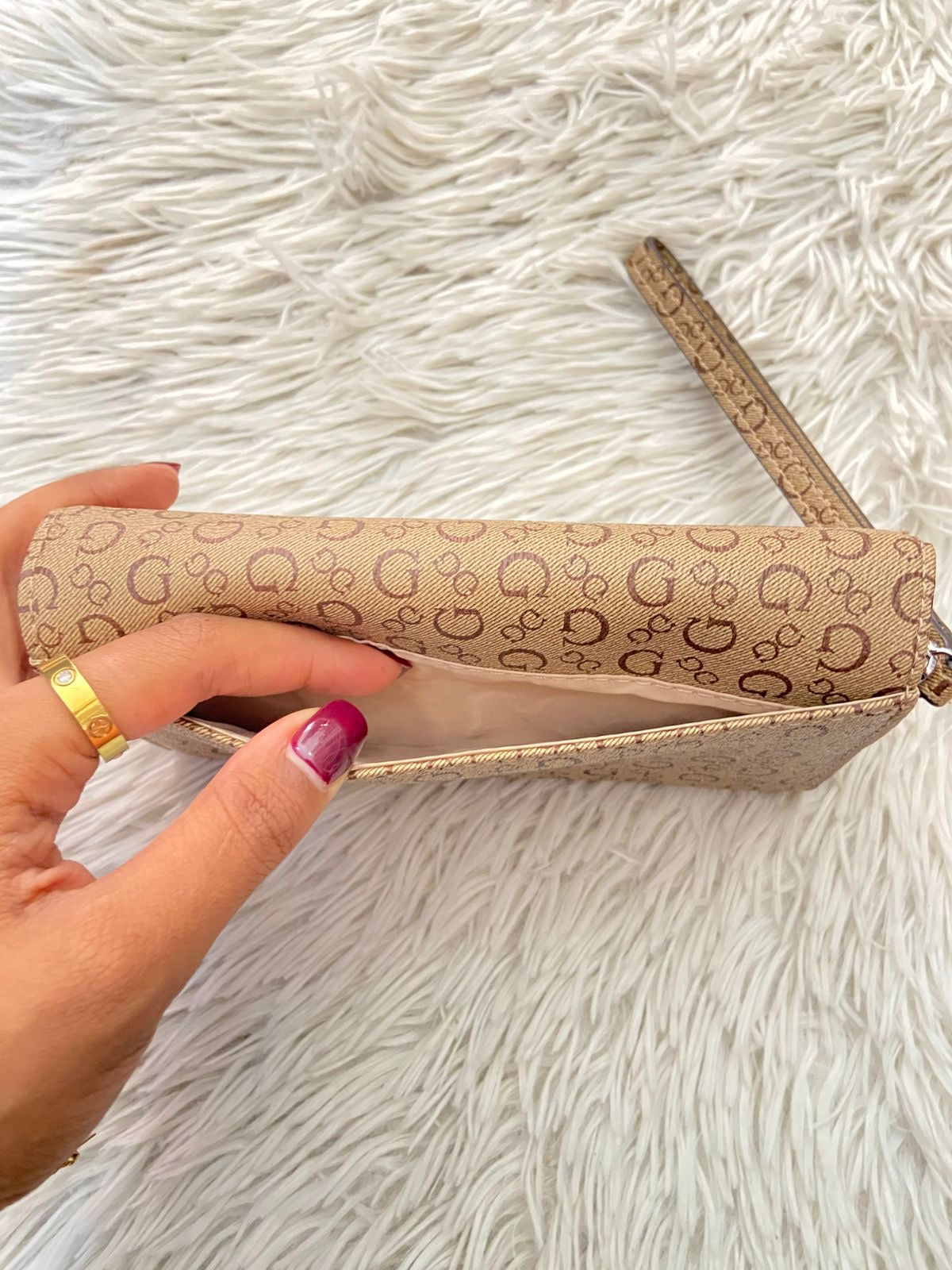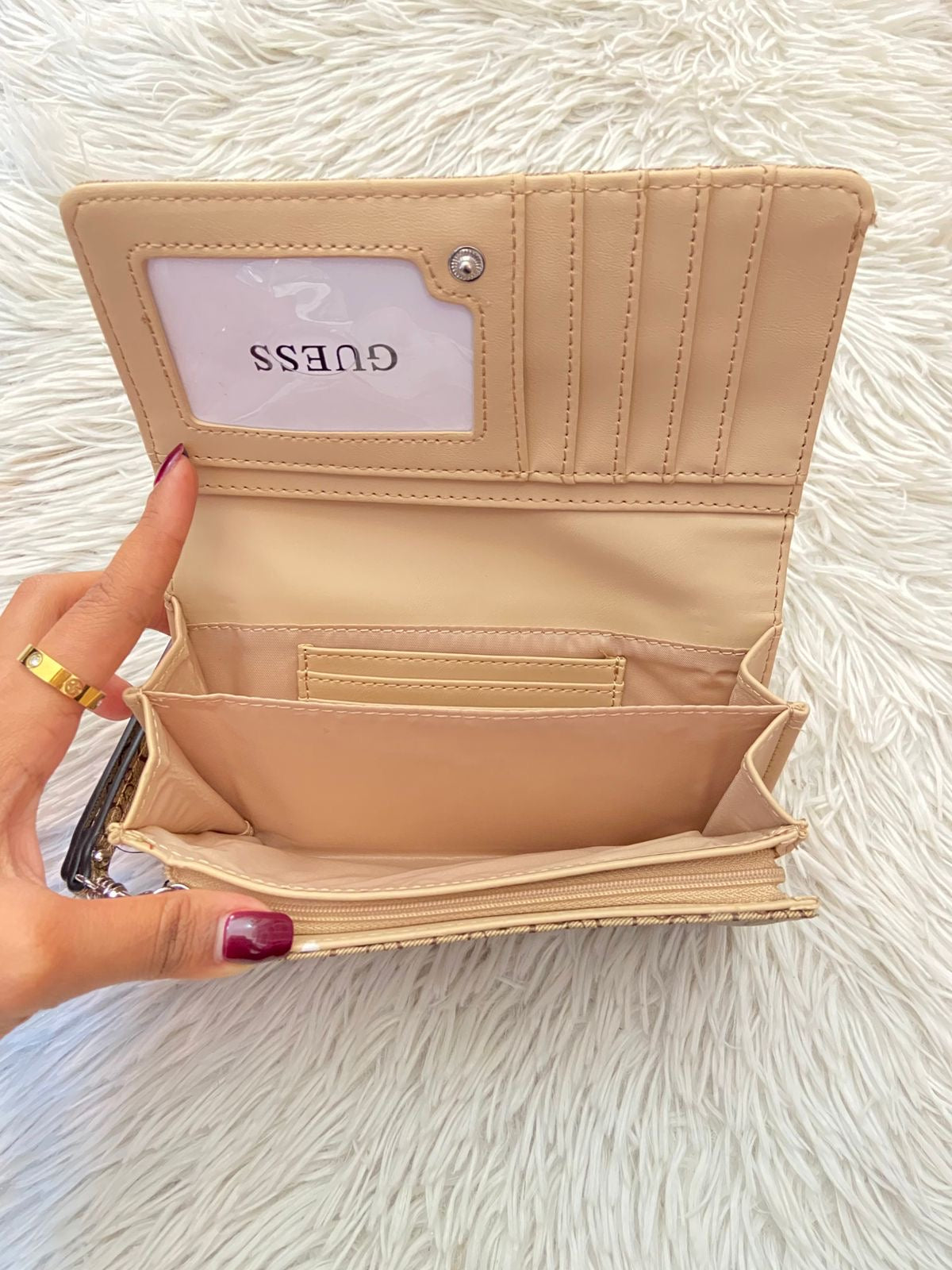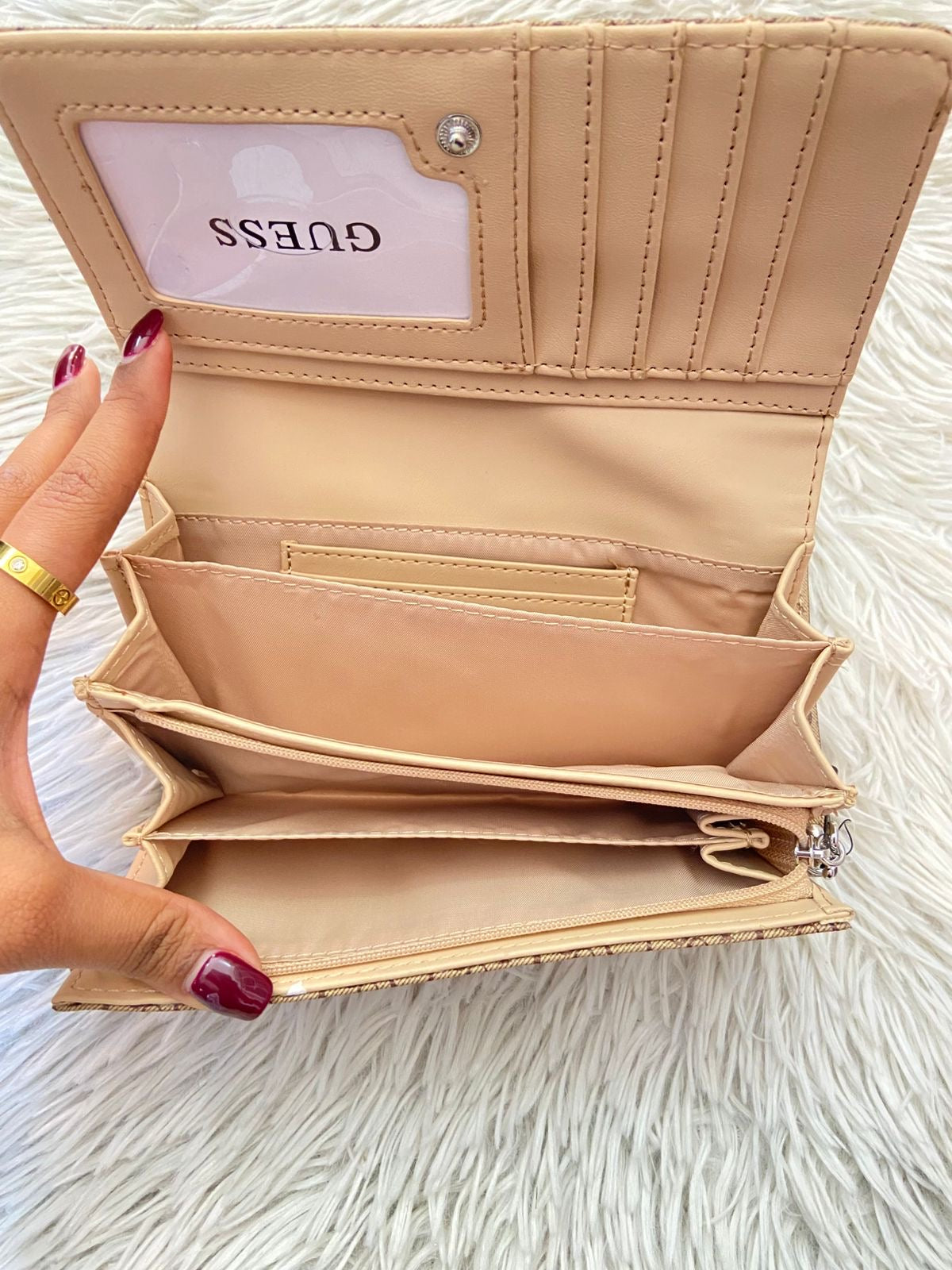 Monedero GUESS original marrón con crema y letras G con placa GUESS en color plateado.