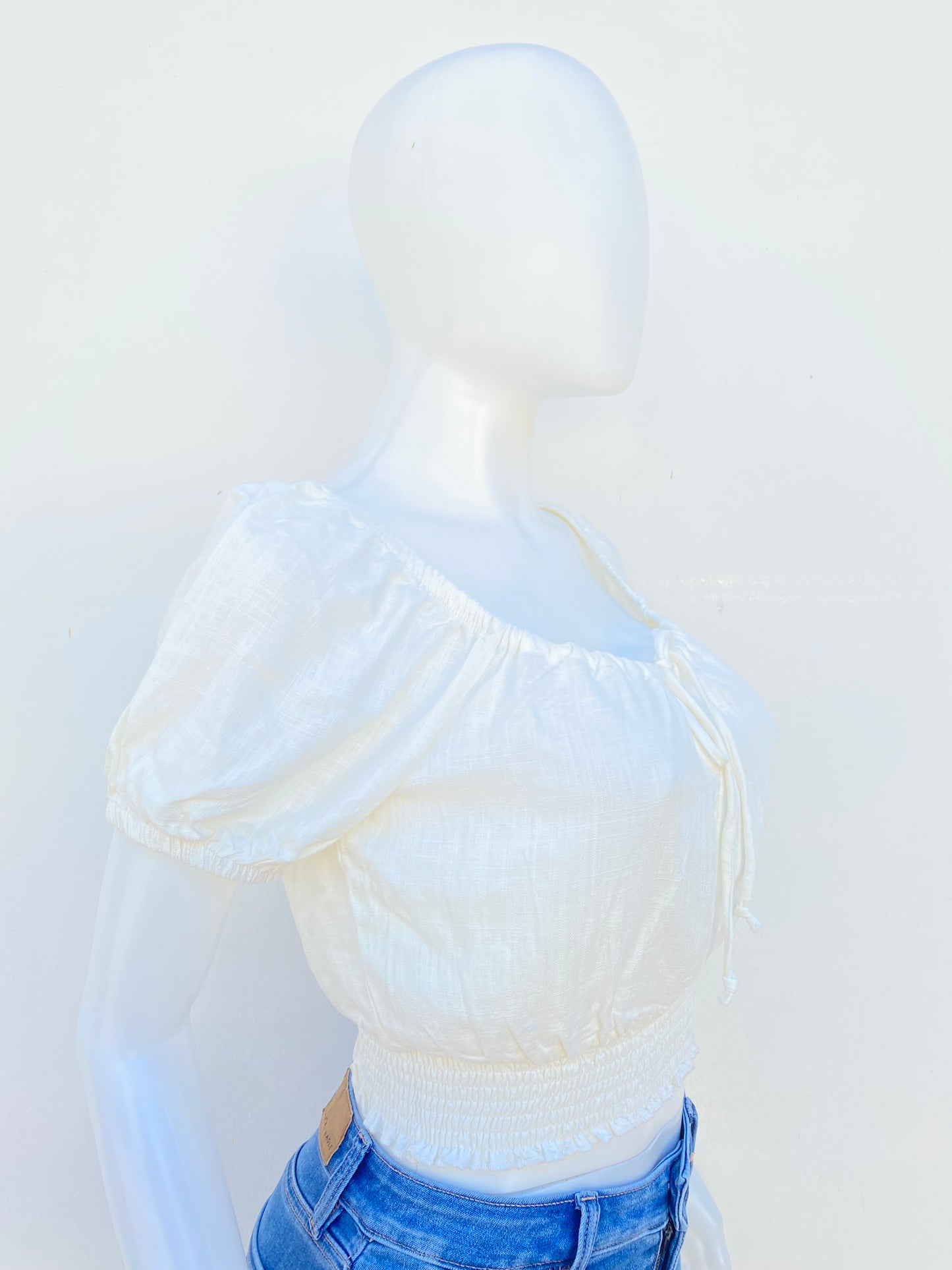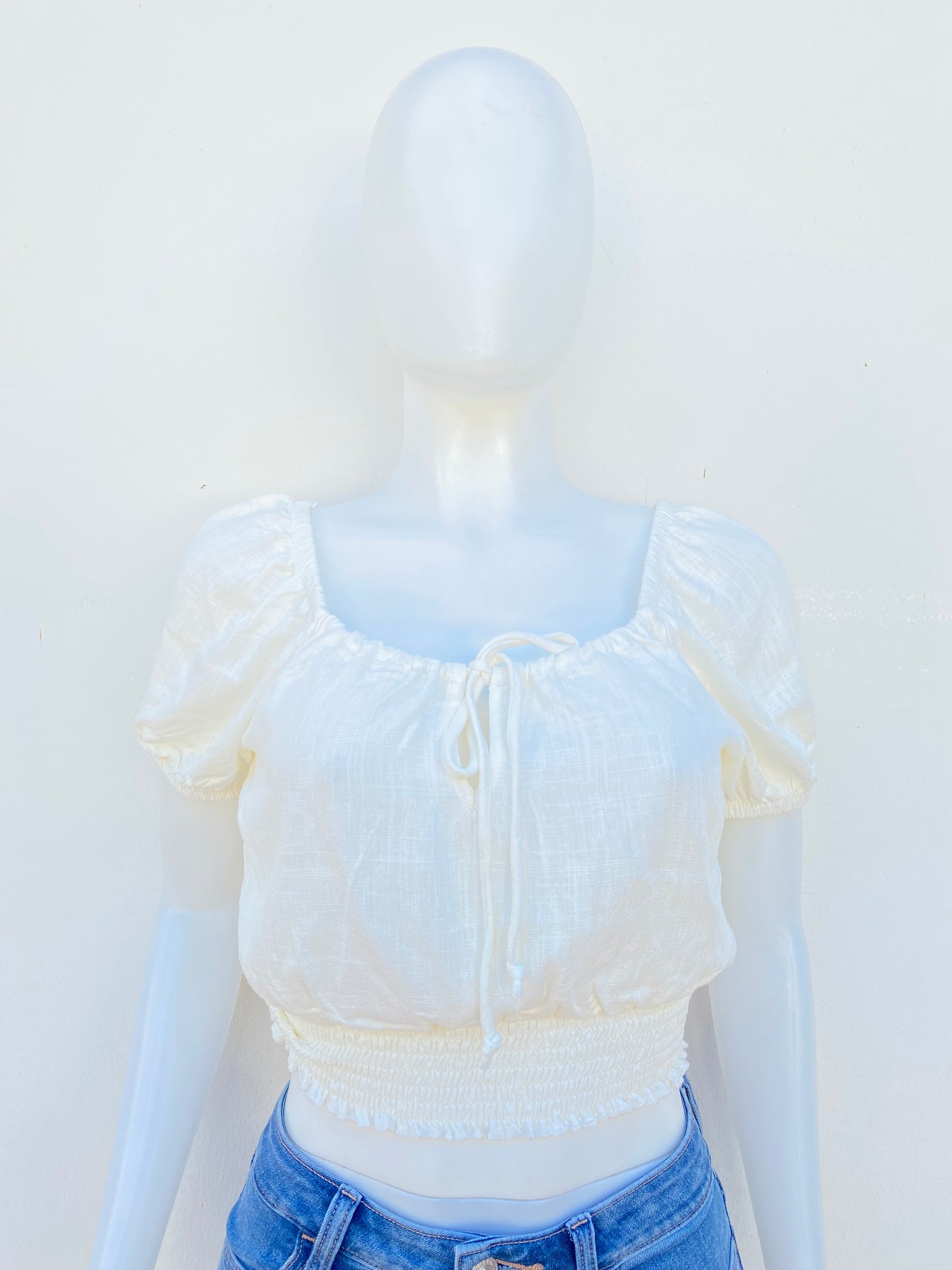 Top/blusa Fashion Nova original, crema, en lino con lazo en la parte delantera.