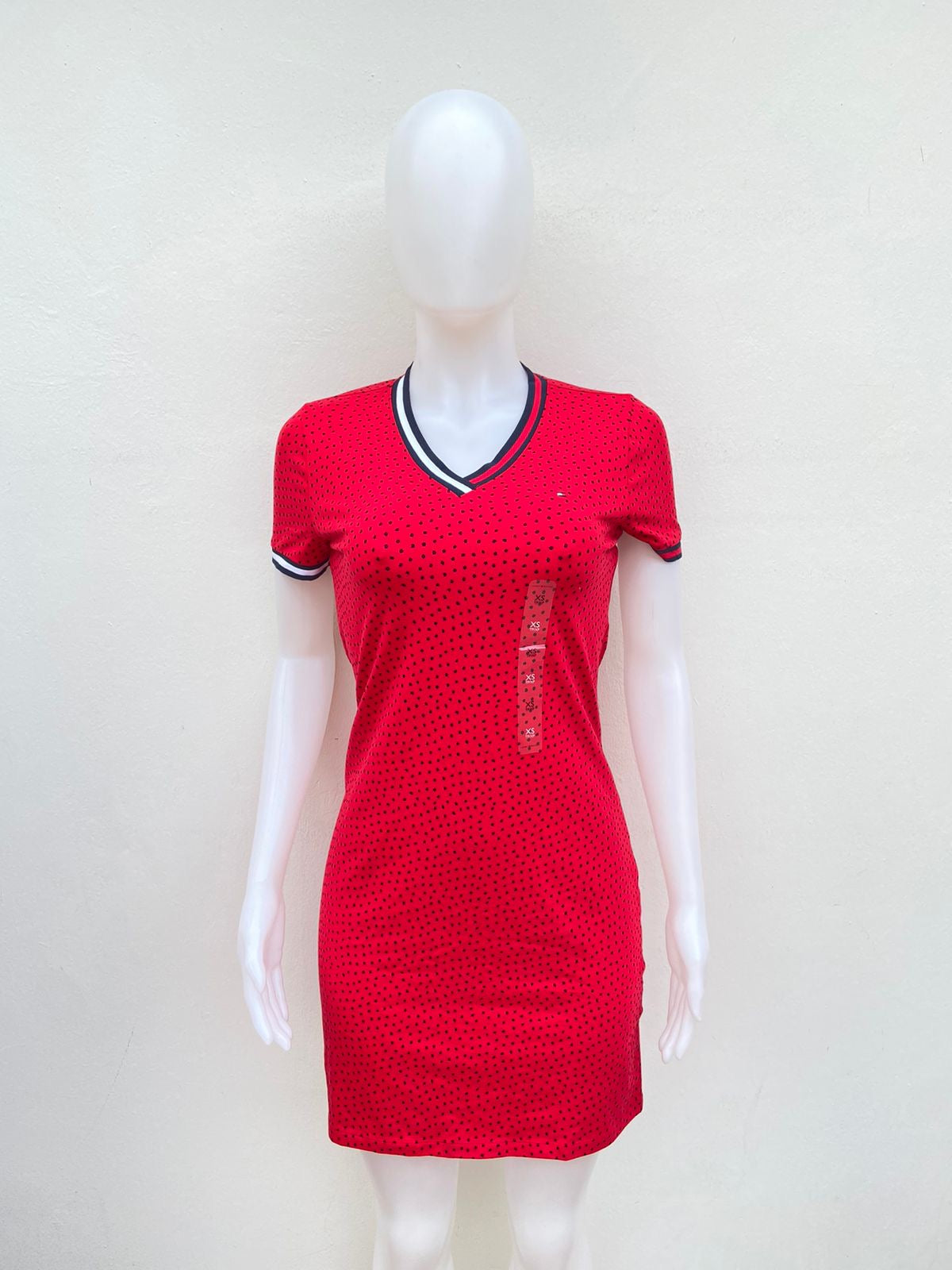 Vestido Tommy Hilfiger original rojo con estampado de bolitas en color azul y cuello en V.