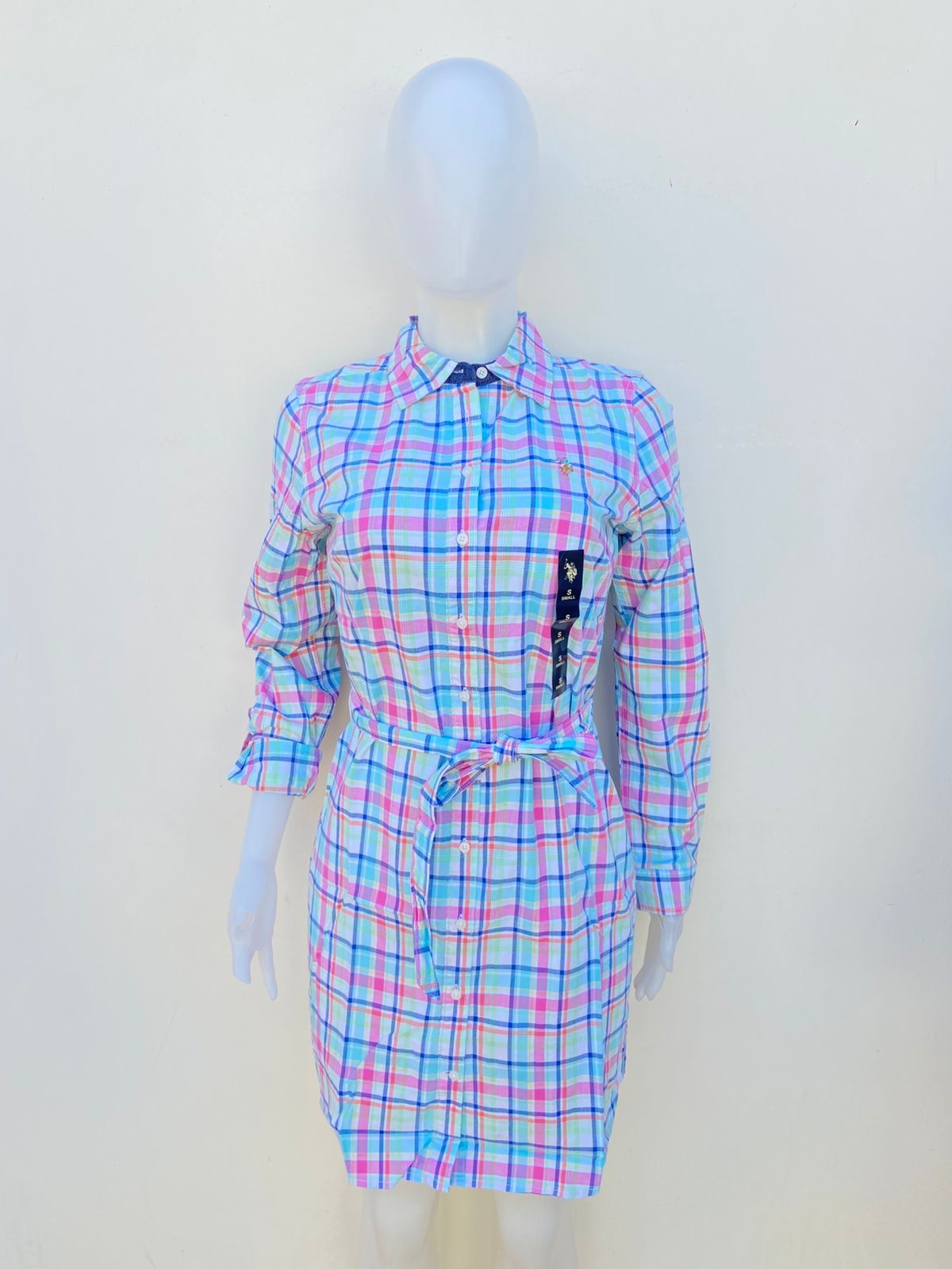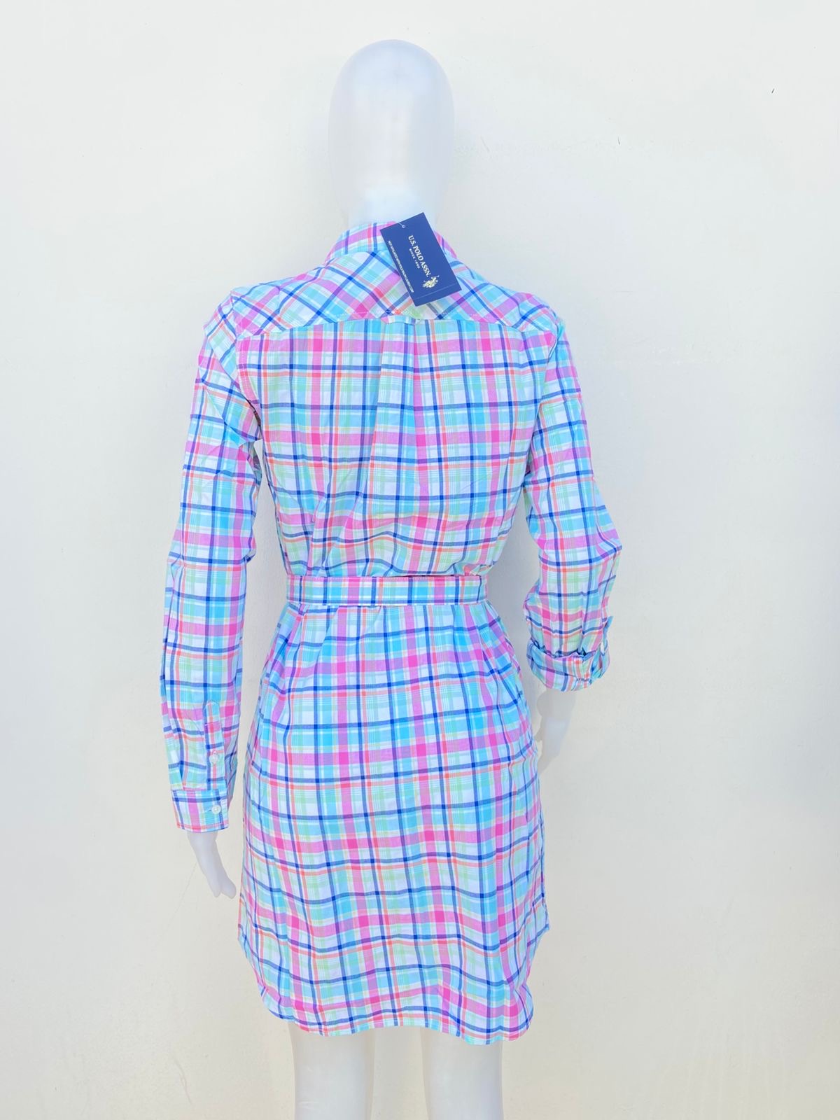 Vestido U.S POLO original azul de cuadritos y lazo ajustable.
