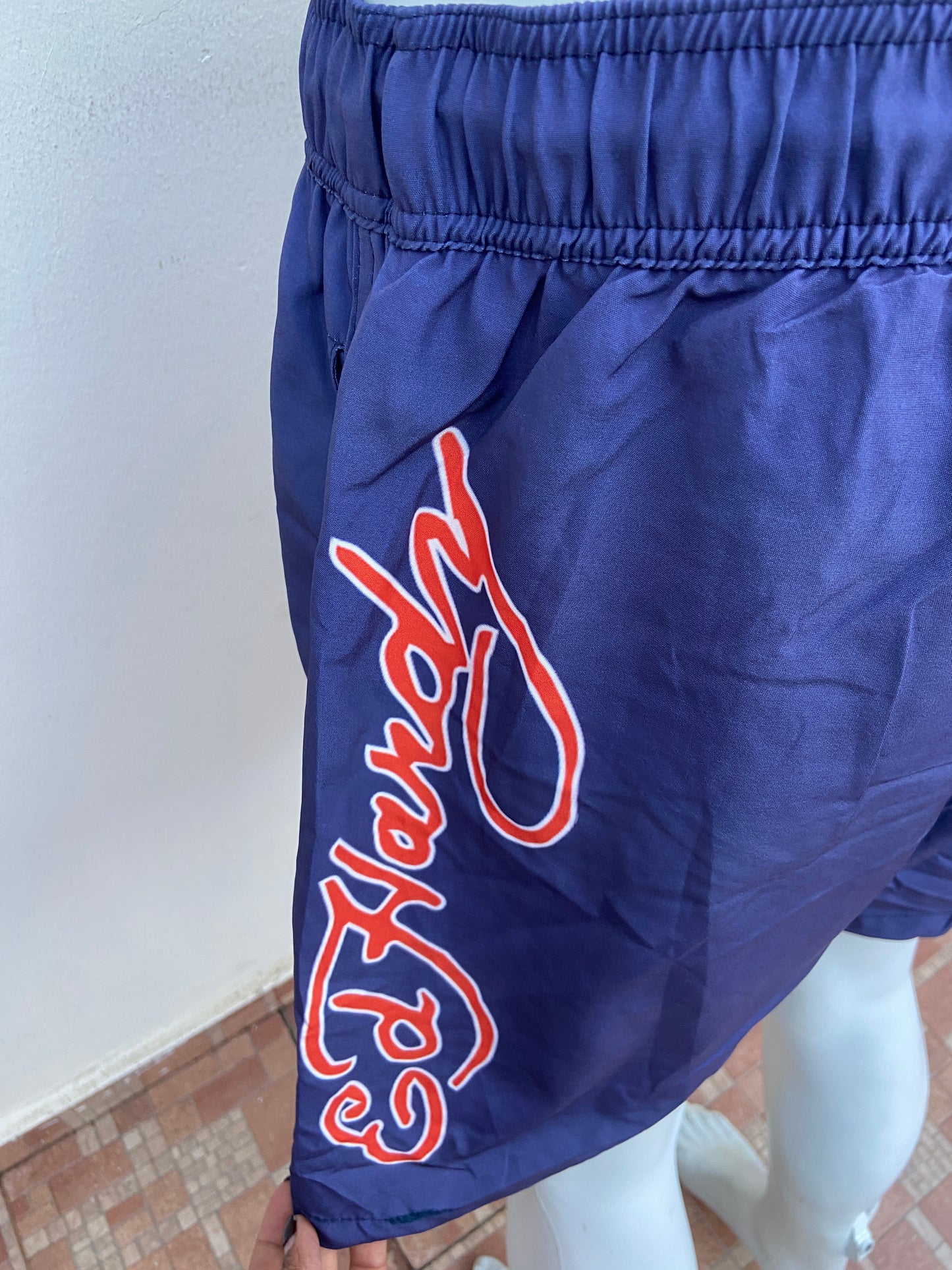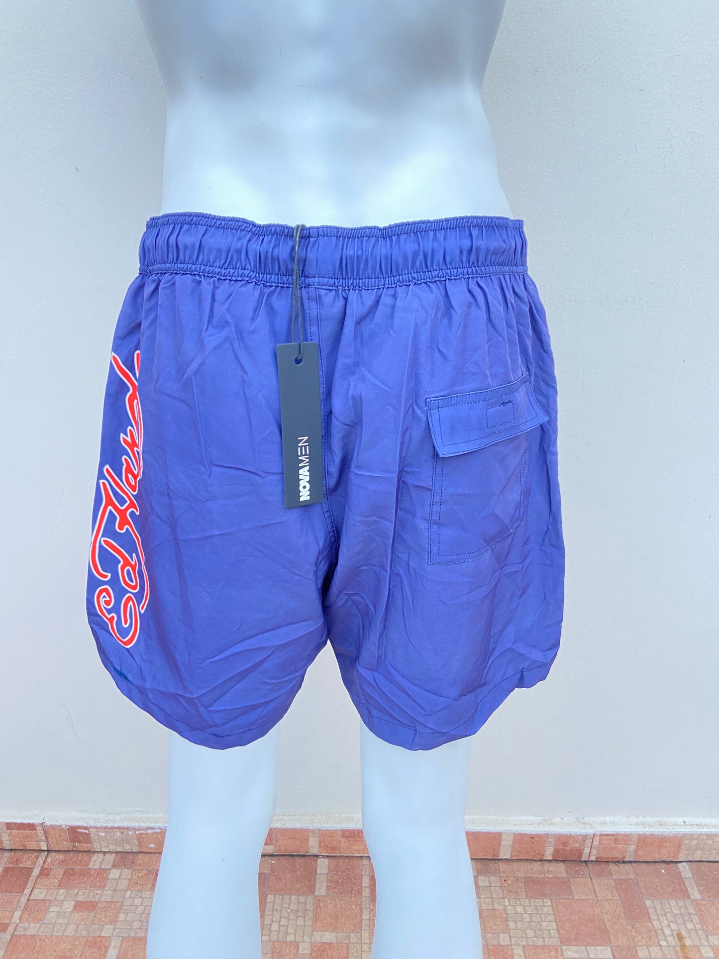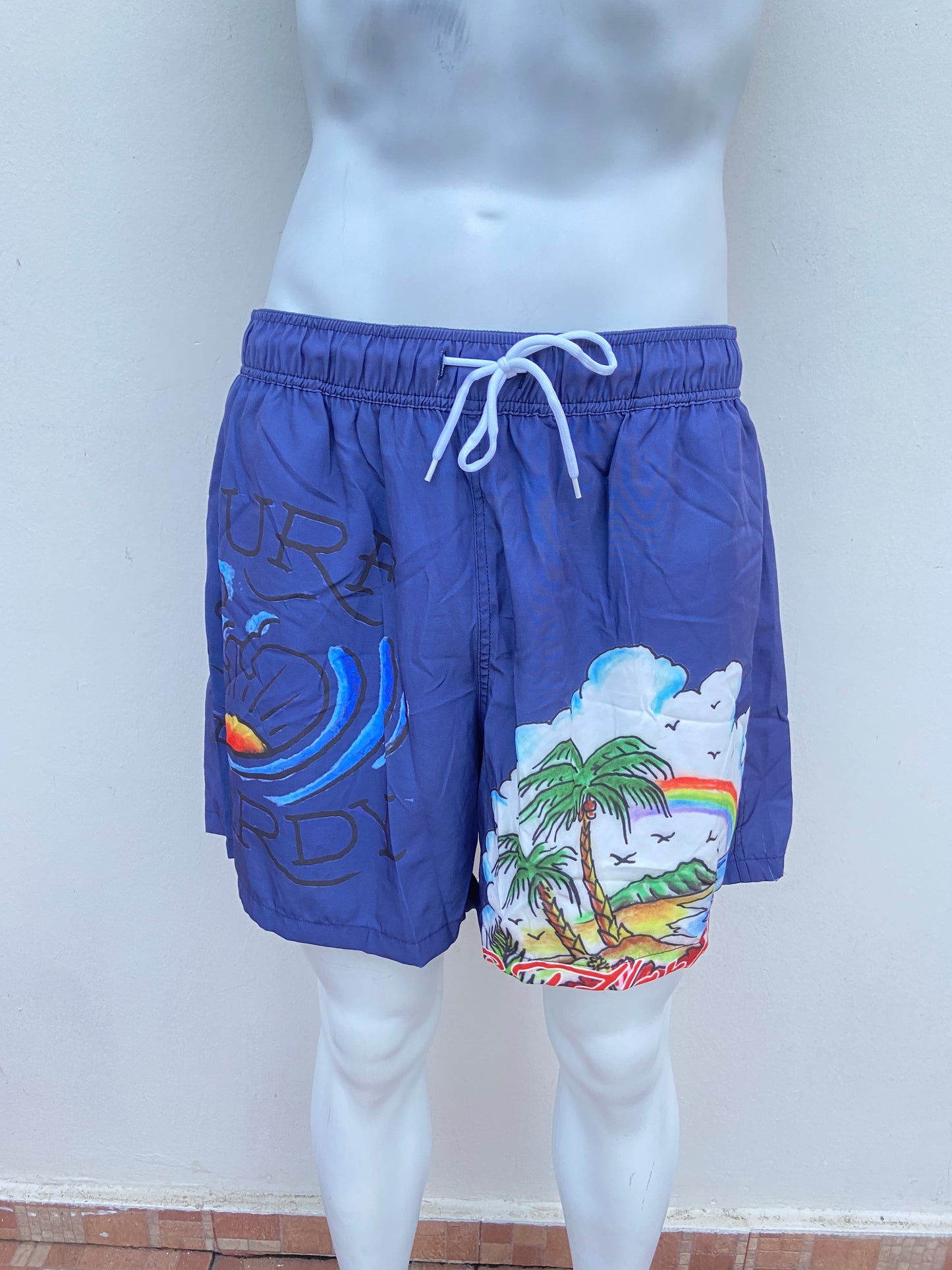 Bañador Baggy, ED HARDY original azul marino con estampado de palmera y arcoíris.
