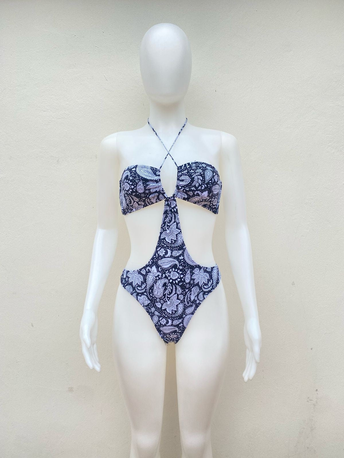 Biquini, de una pieza negro y blanco con estampado de flores y lazo cruzado en la parte superior.