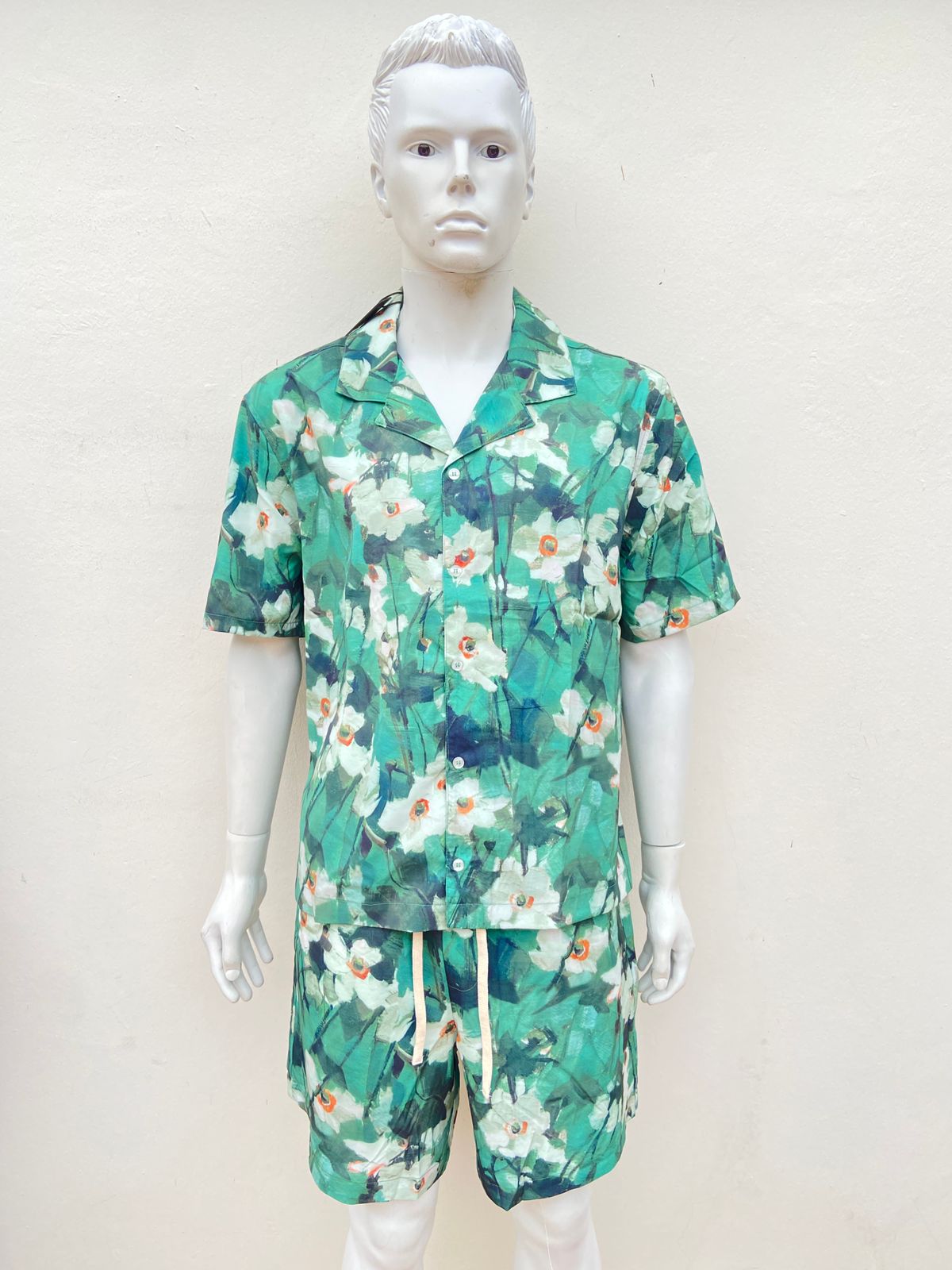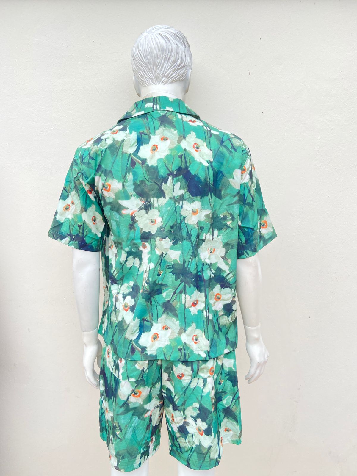 Conjunto bermuda pantalón corto y camisa verde con rosas verdes limón con blanco.