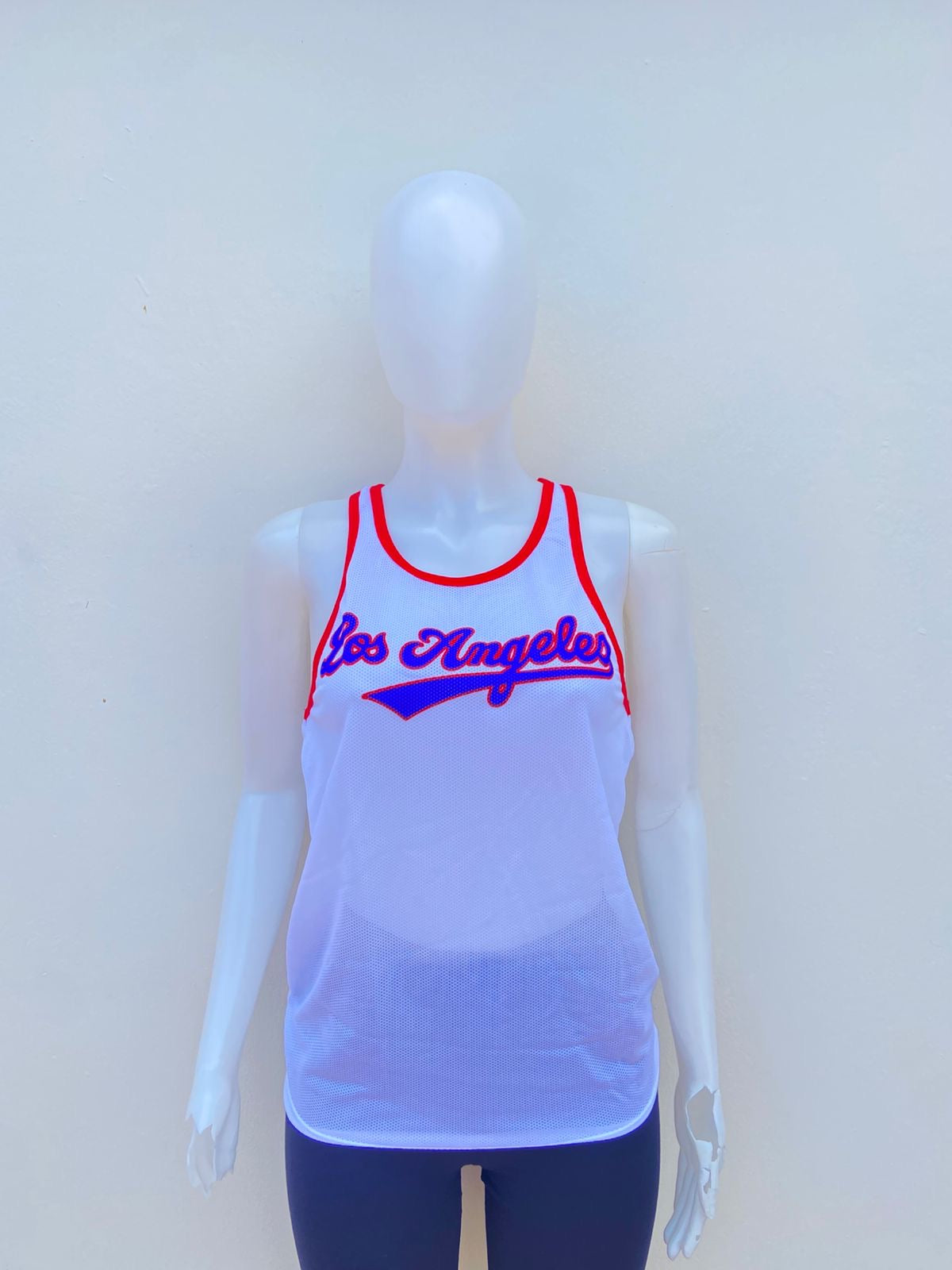 Franela blanca de mayas con letras en color azul LOS ANGELES y numero 86 atras.