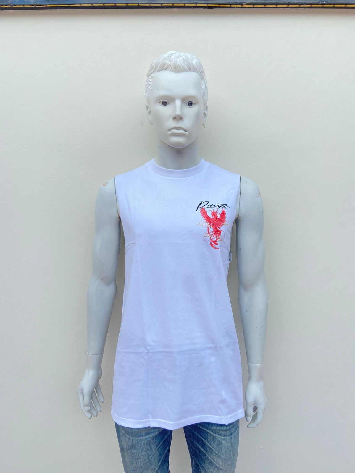 Franela blanco con diseños de un Fenix y letra negra arriba