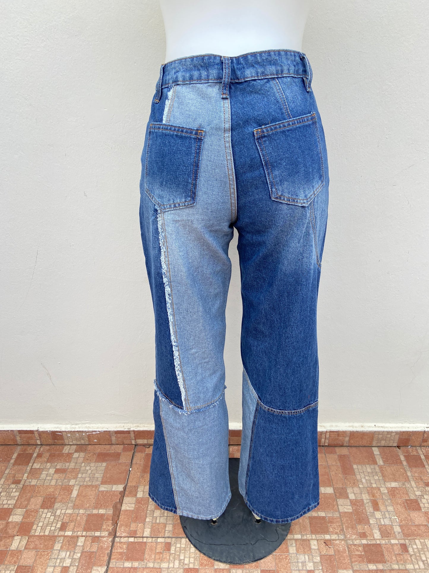 Pantalón Jean, azul oscuro con lazo en azul claro, acampanado.
