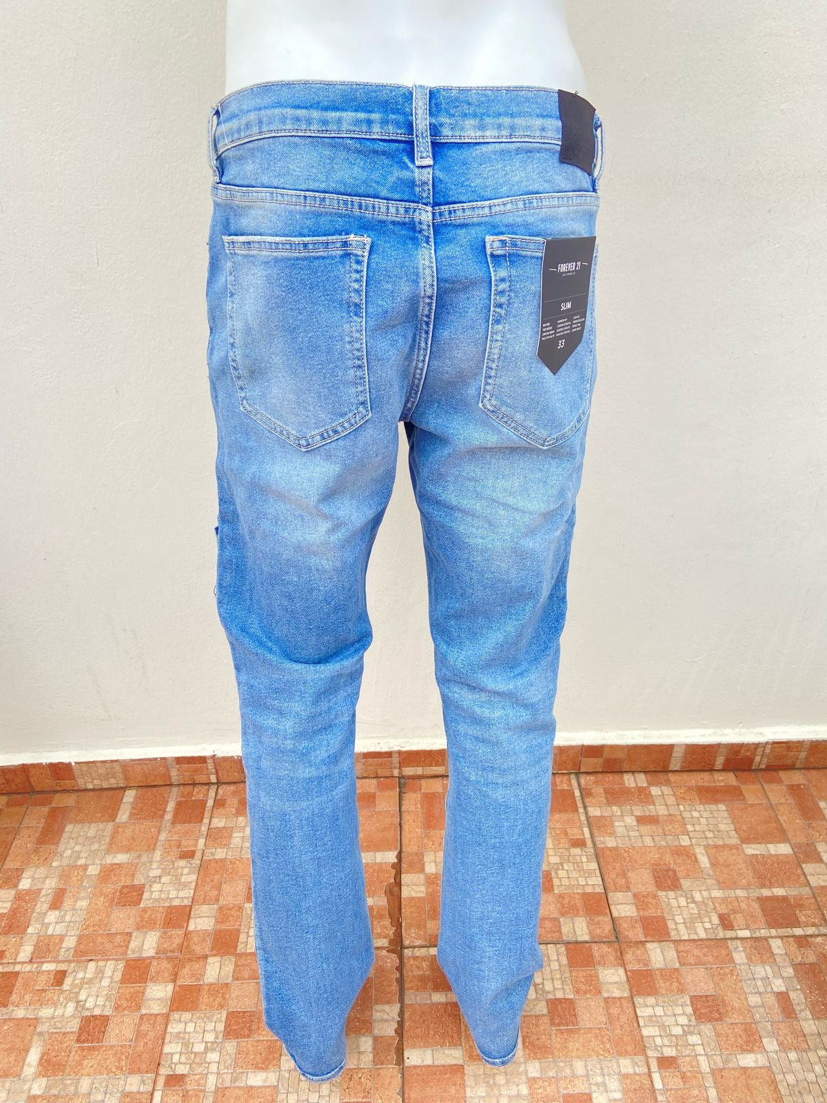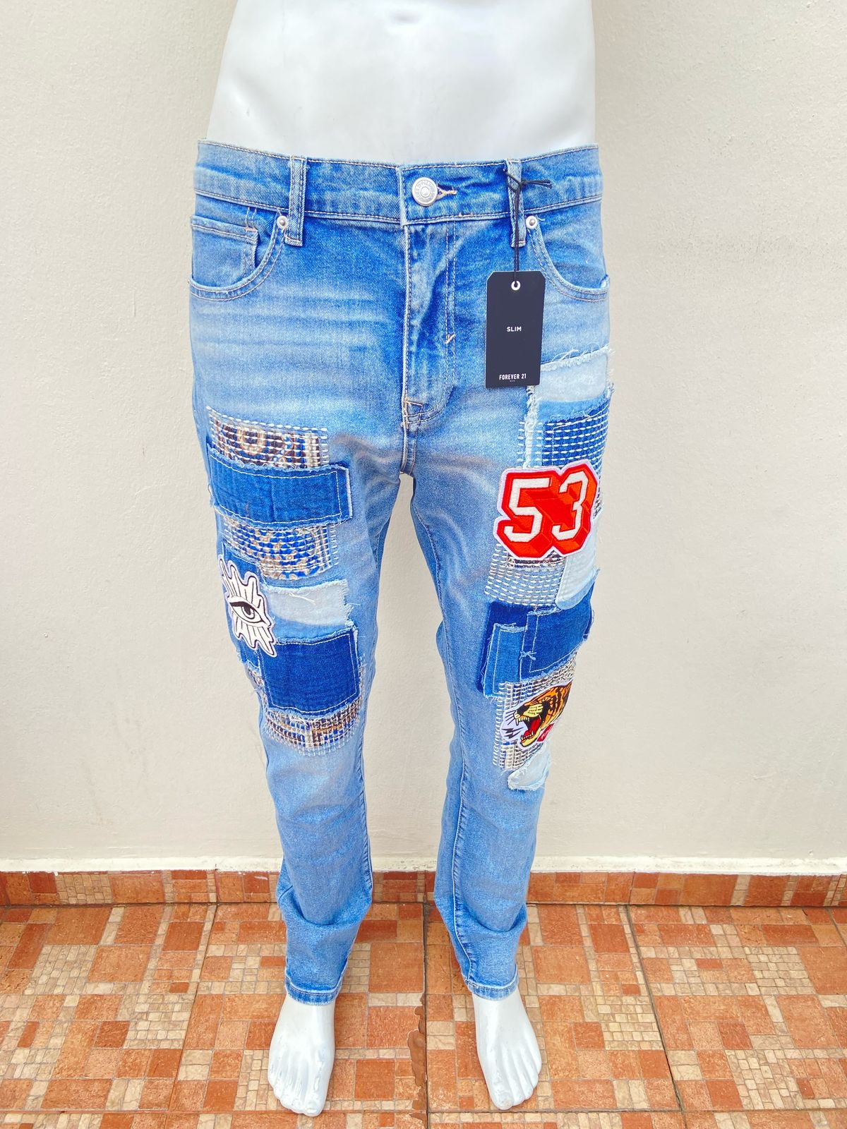 Pantalón Jean hombre Forever 21 original azul claro con estampado de león y el número 53.