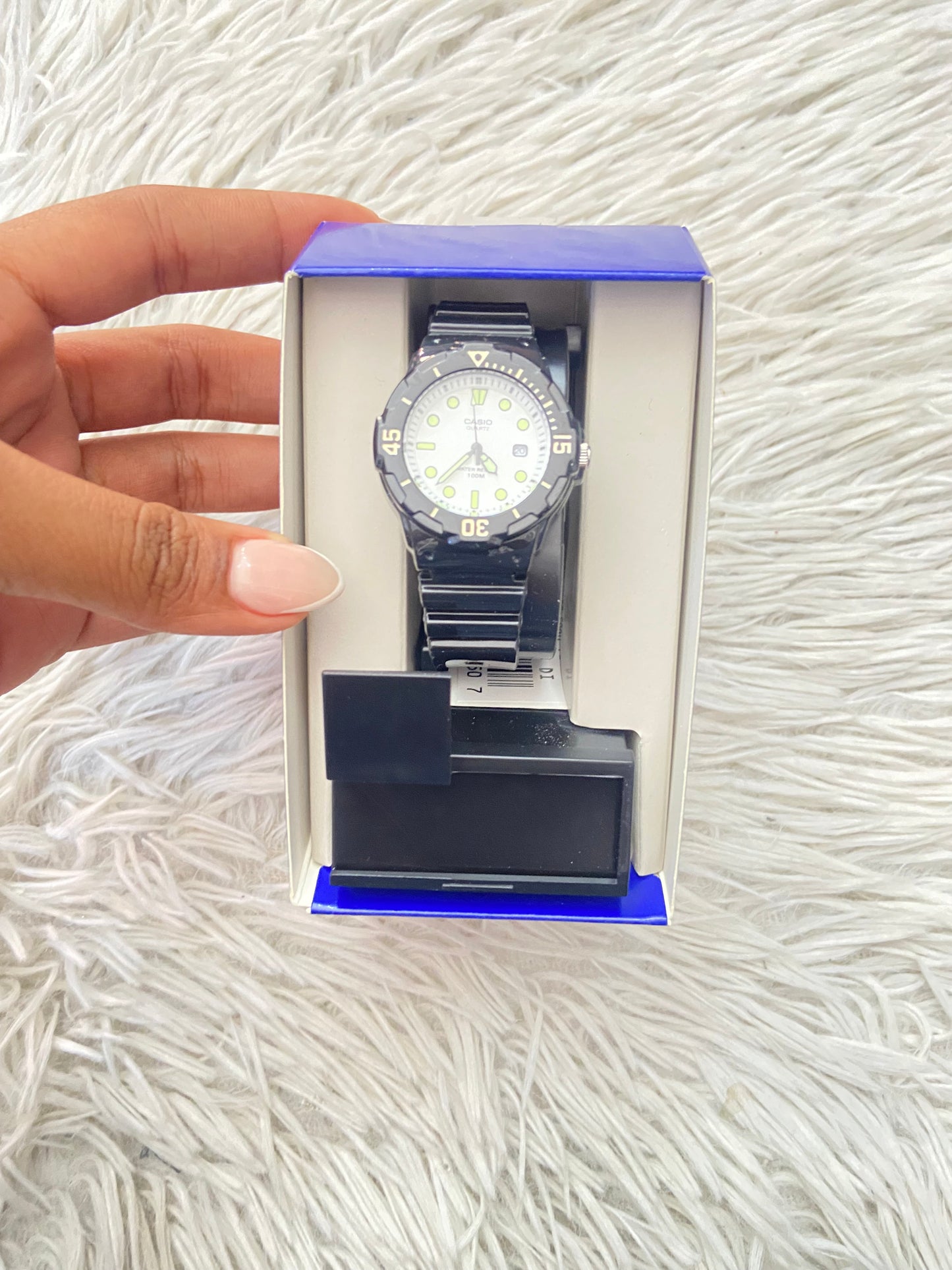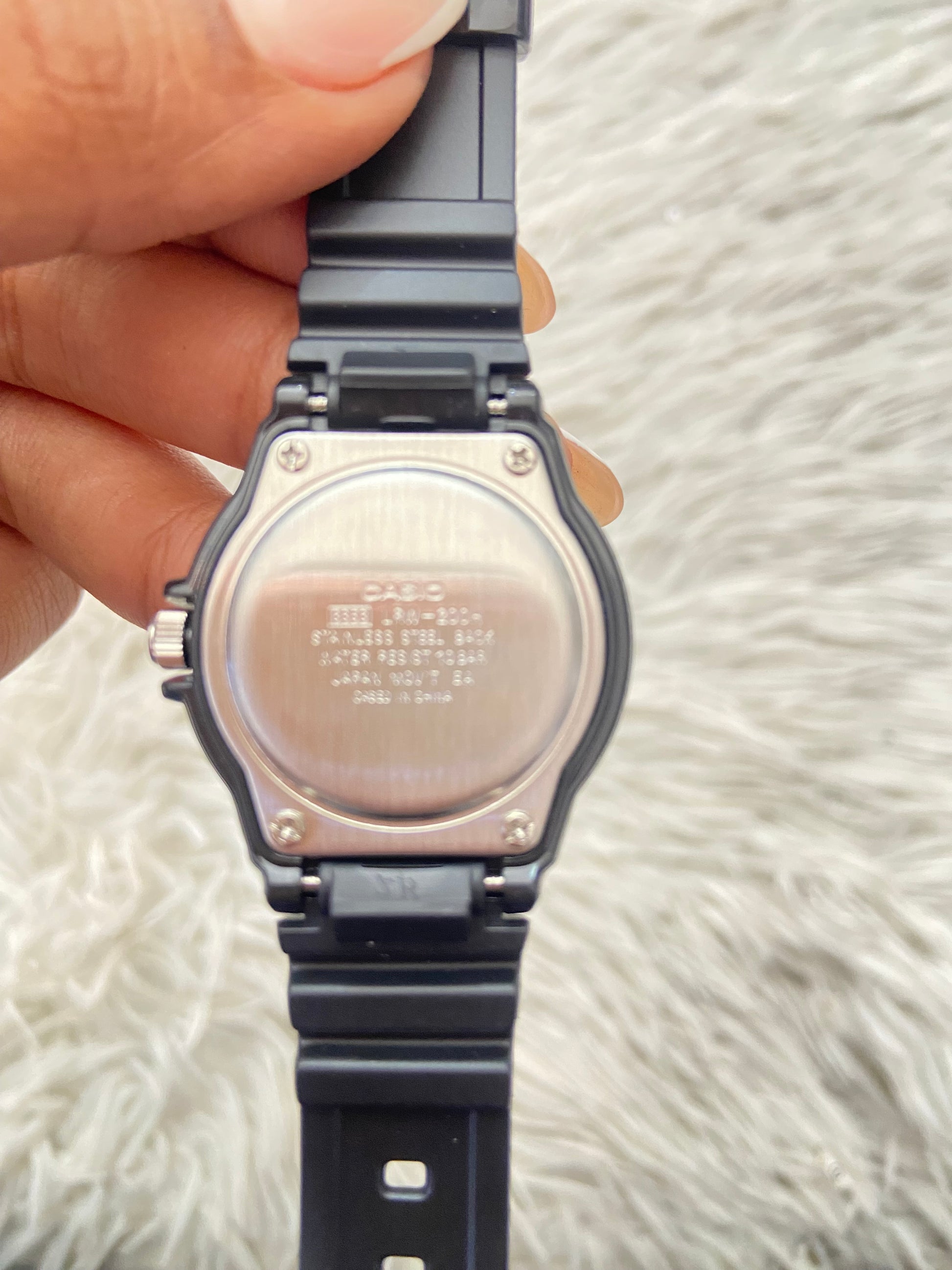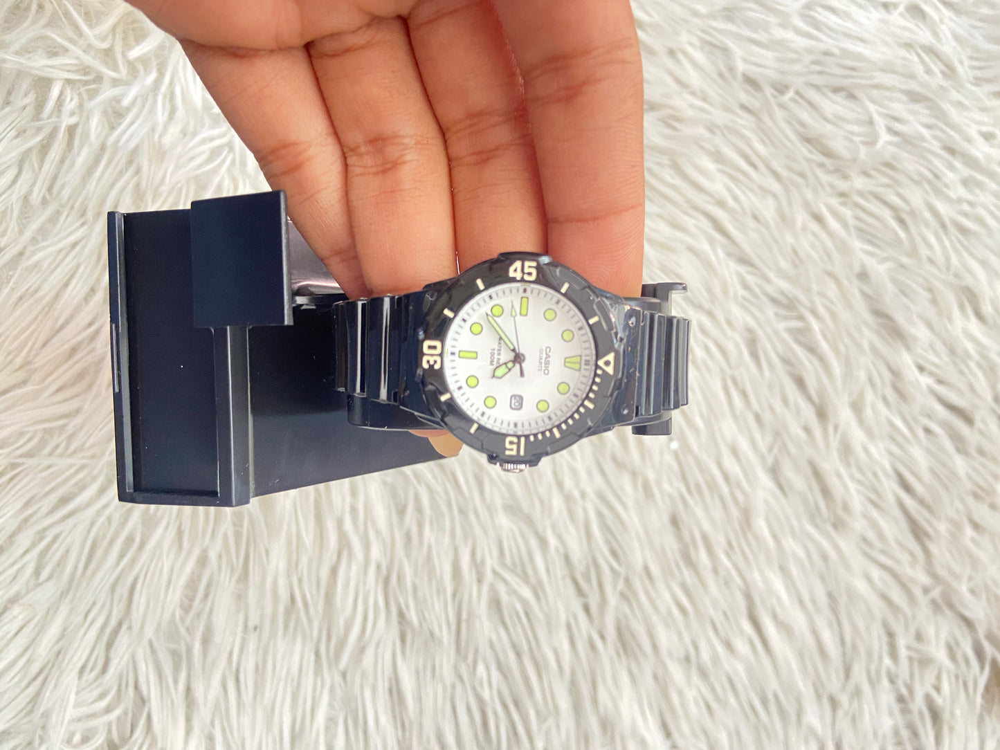 Reloj Casio original negra con fondo en color blanco y verde.