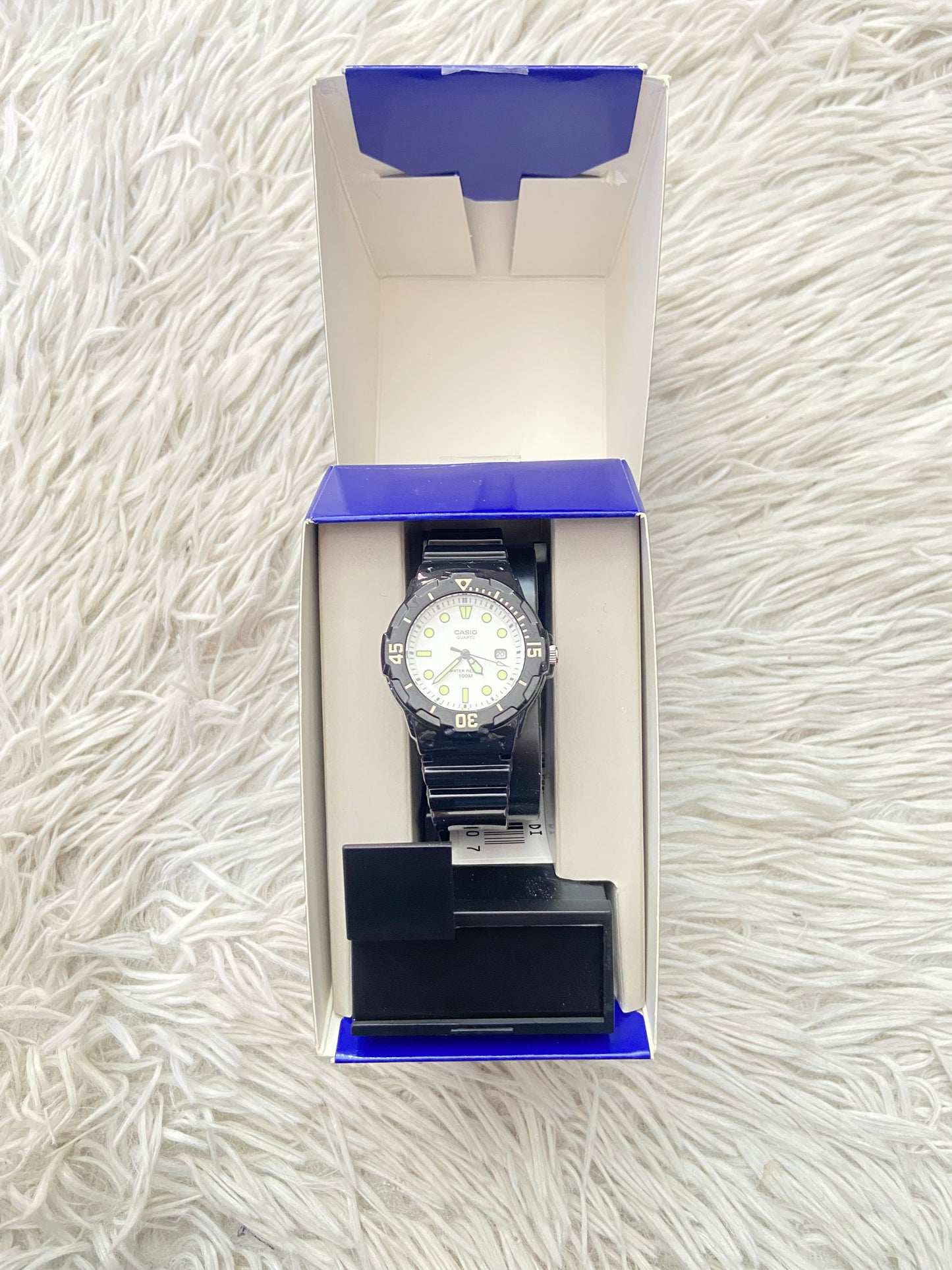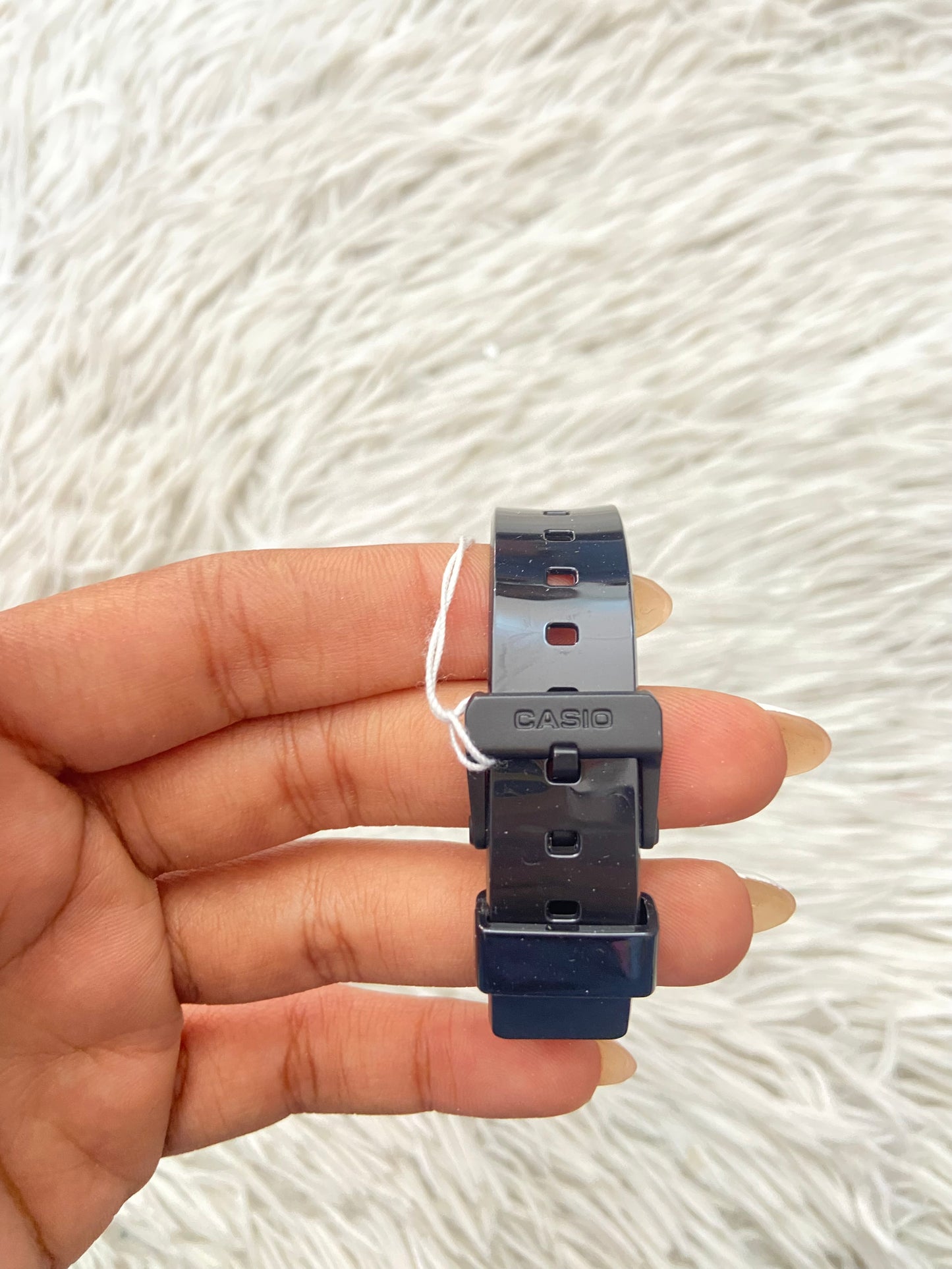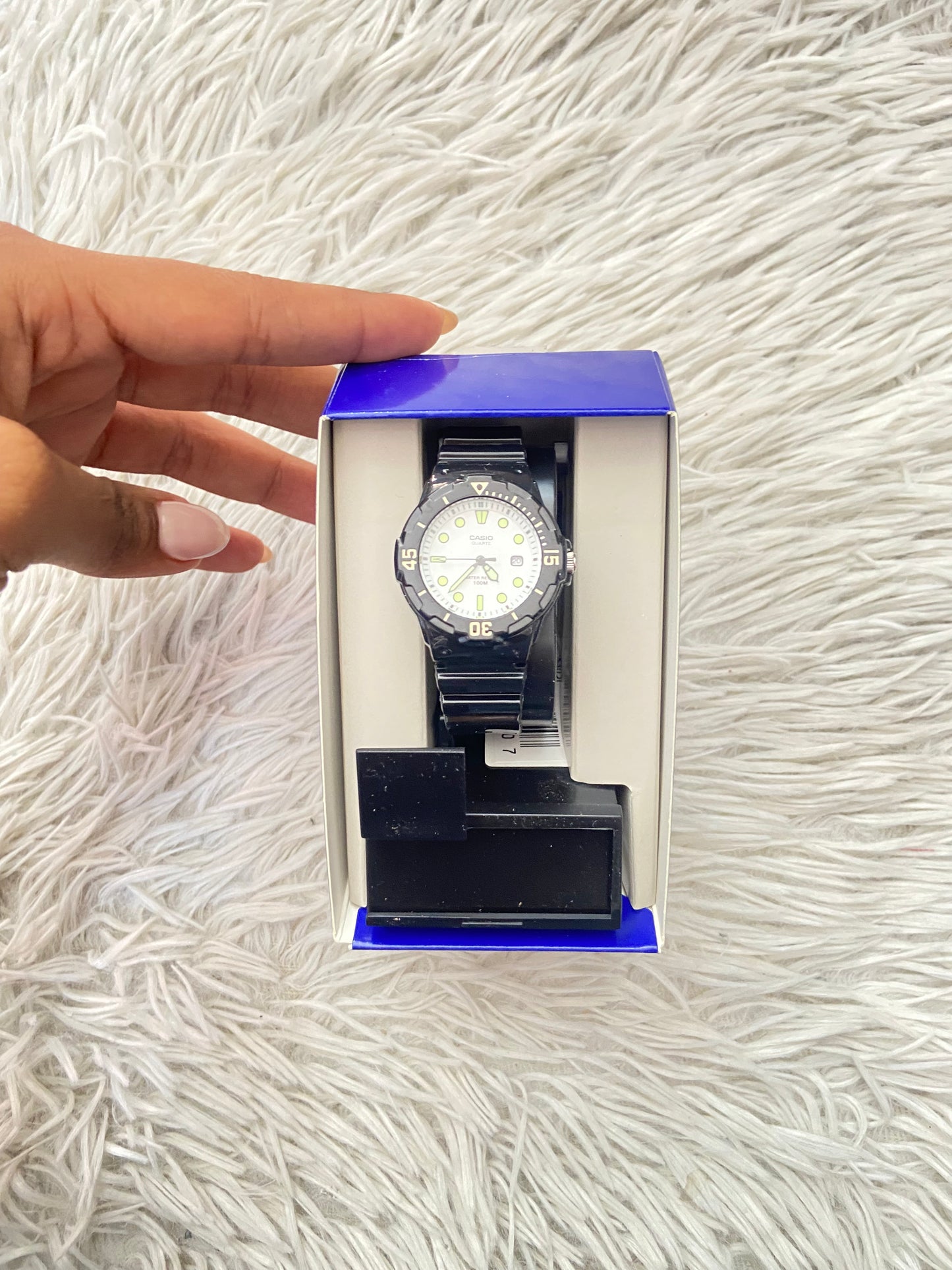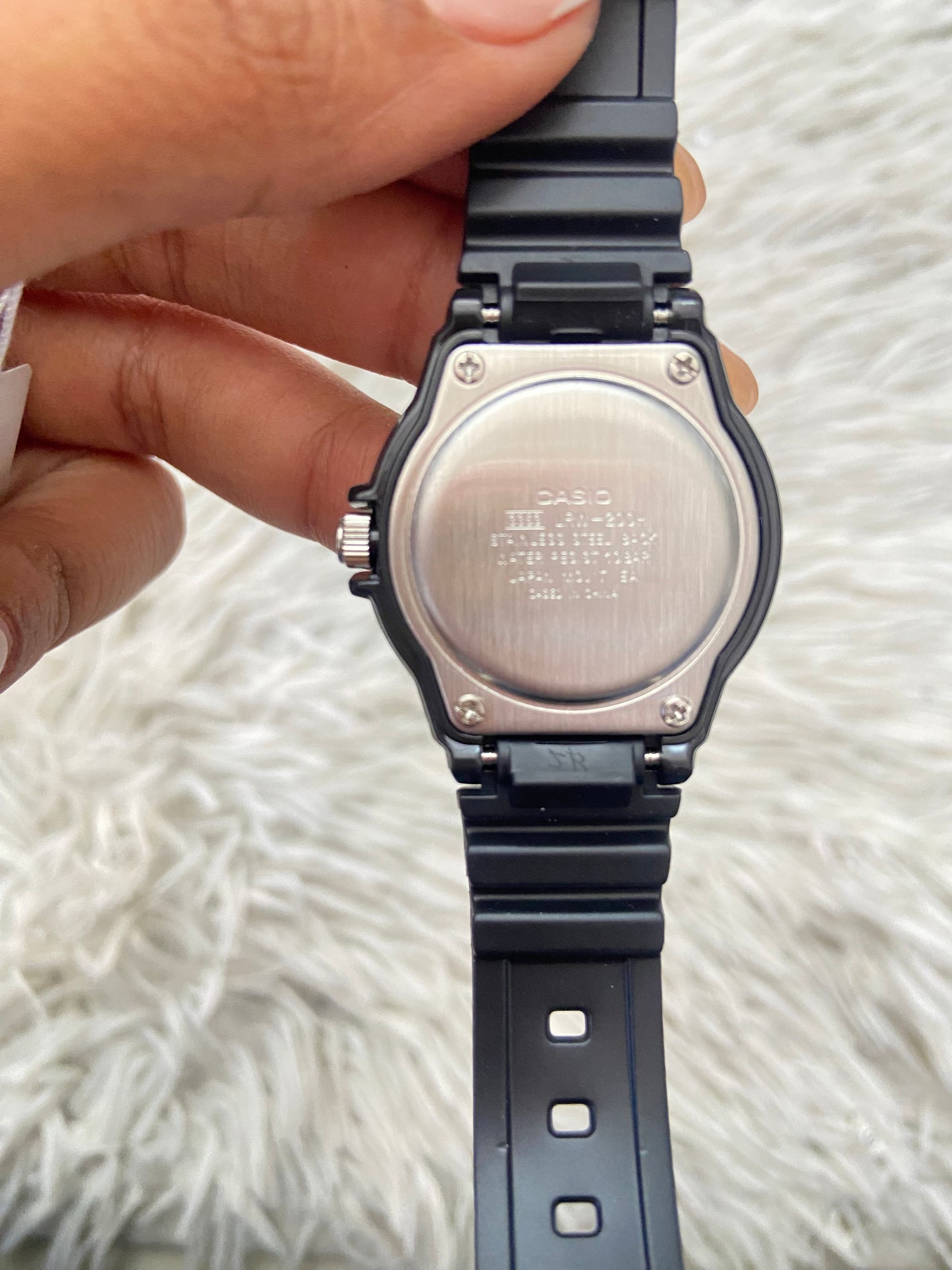 Reloj Casio original negra con fondo en color blanco y verde.