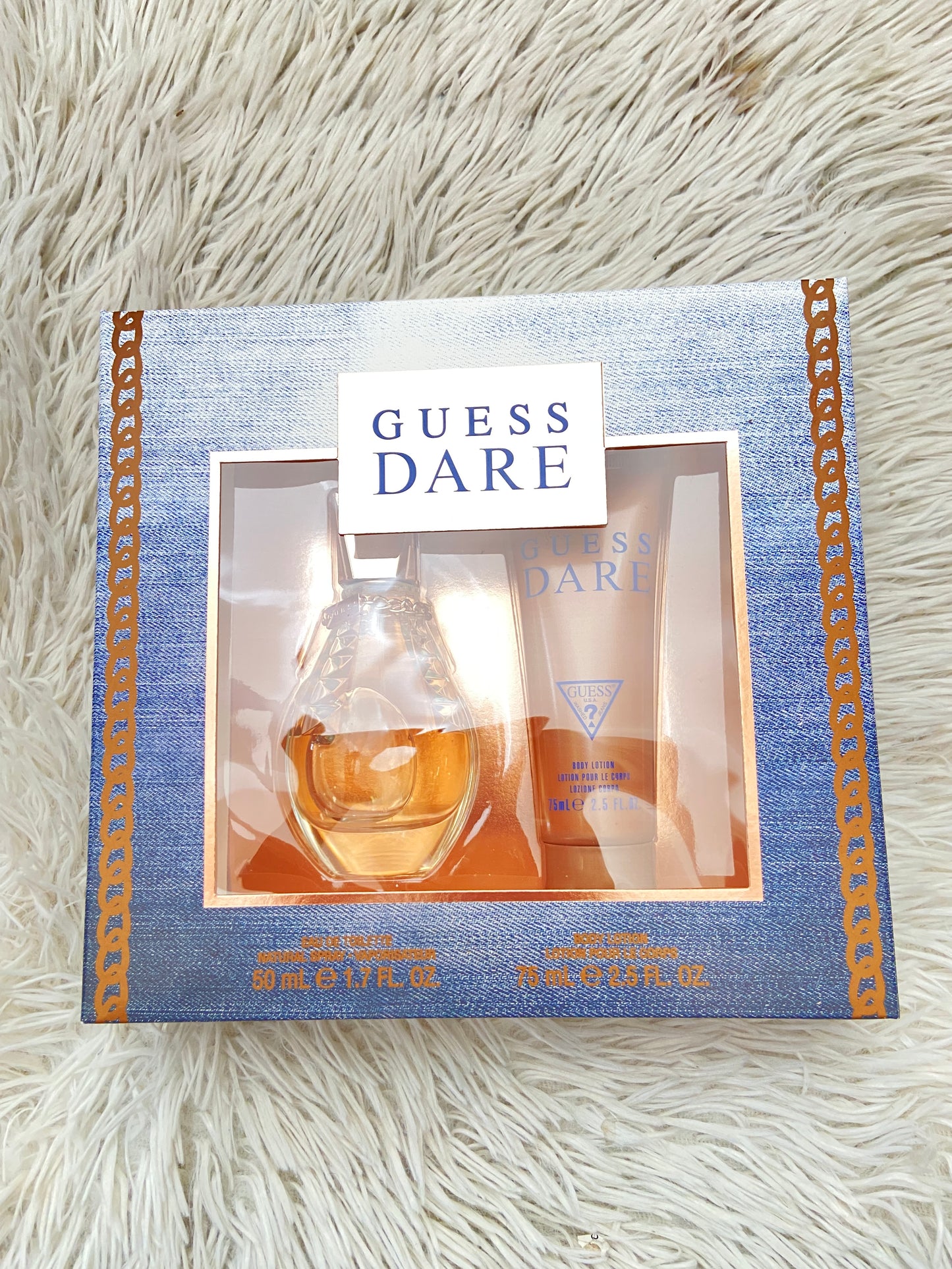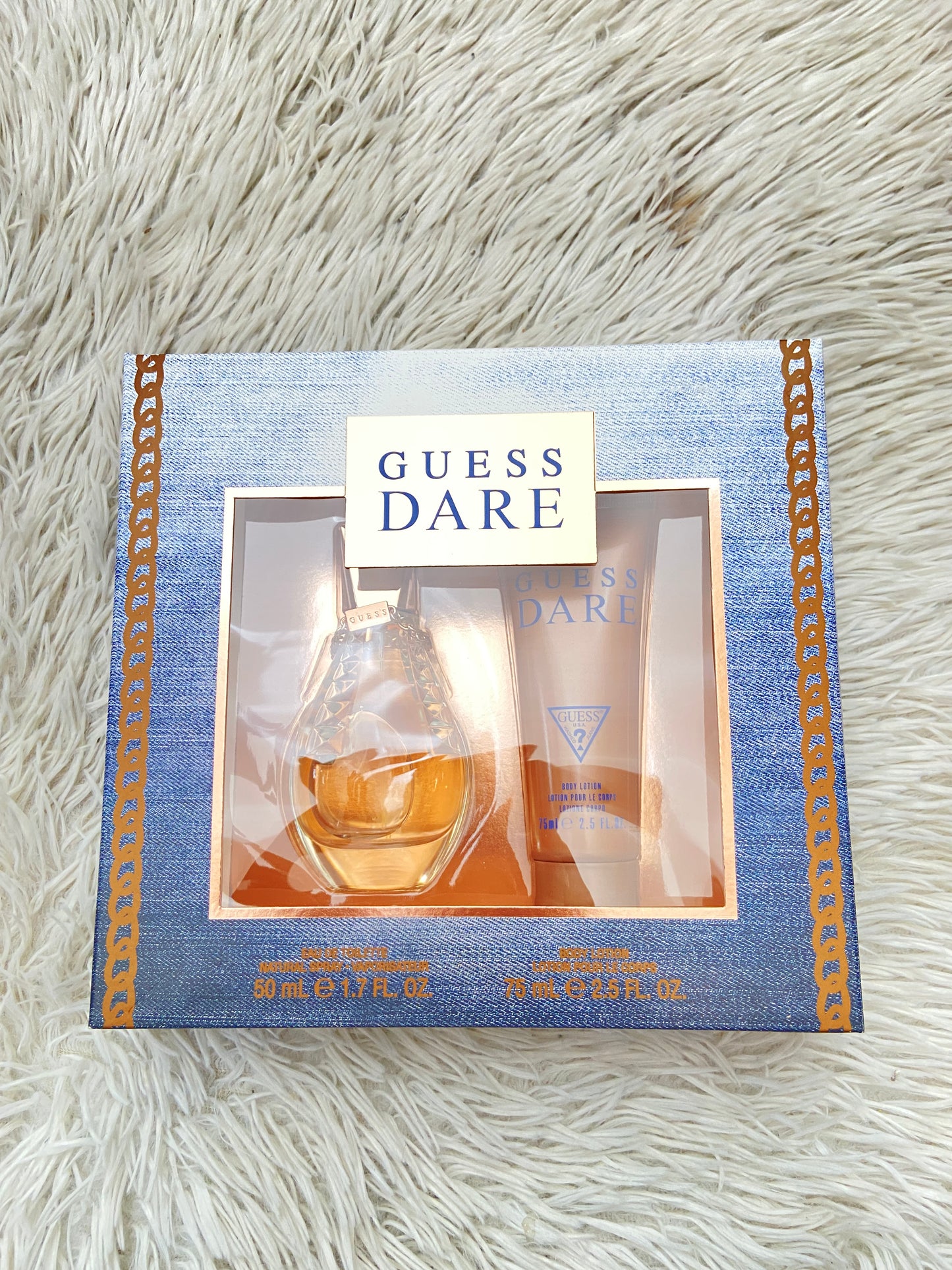 Set GUESS DARE original dorado con azul y cadena, de perfume y crema.