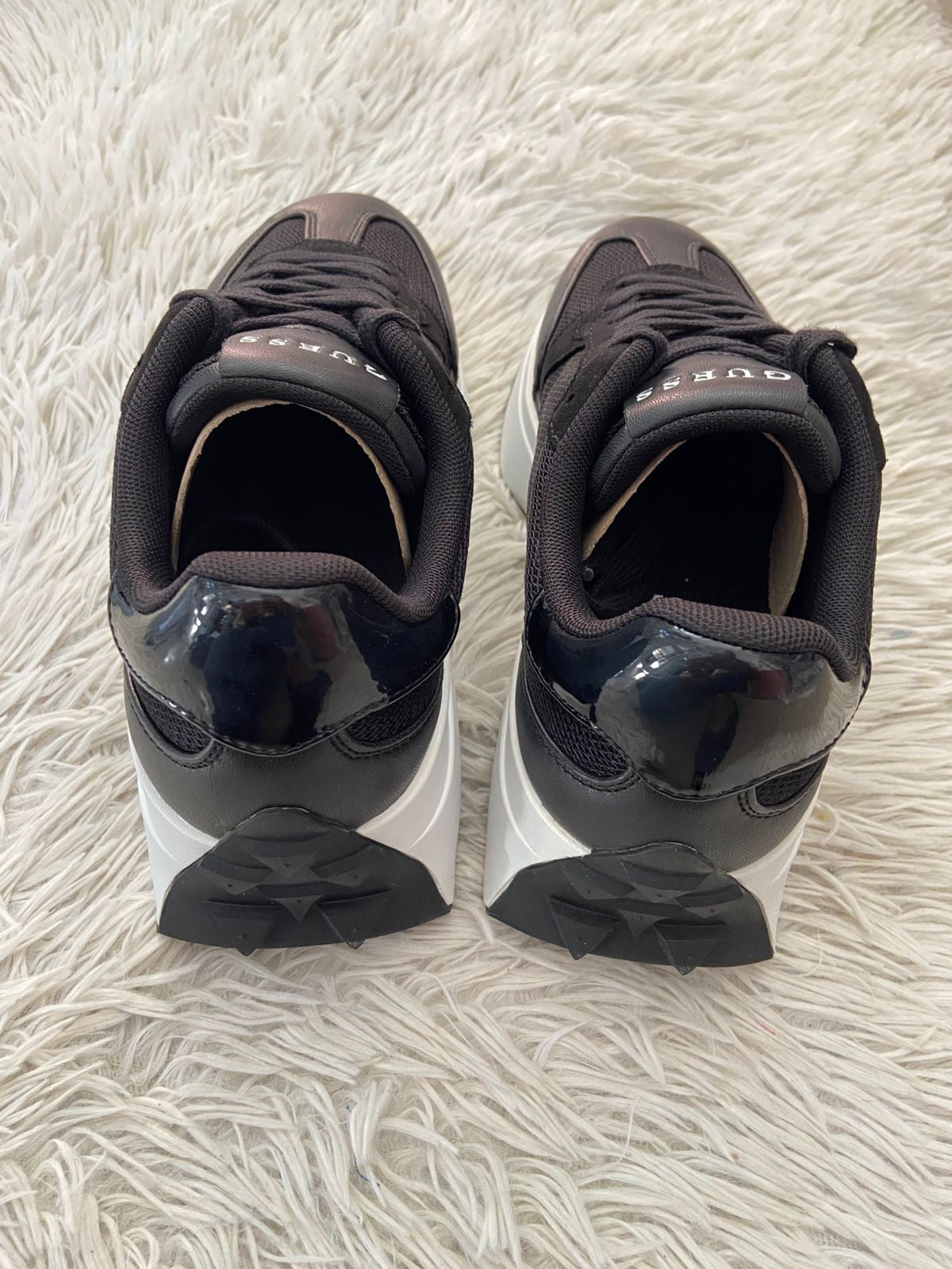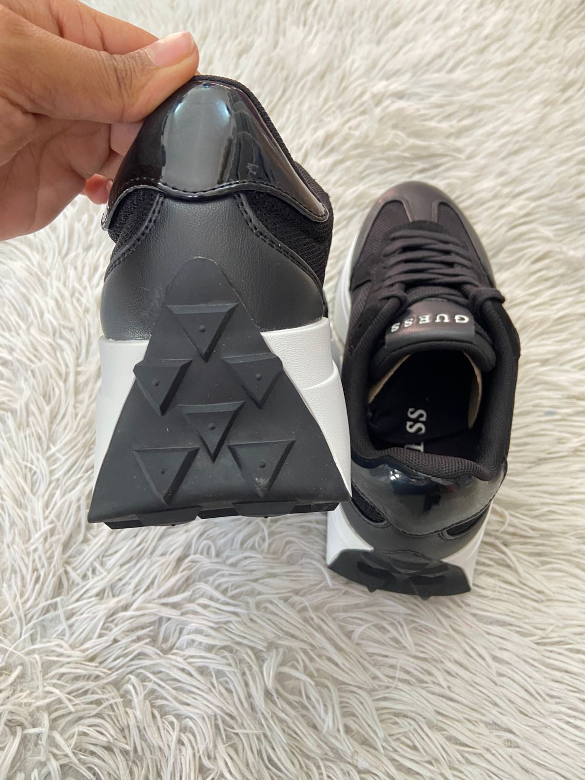 Tenis GUESS original negro, con suelas altas en color blanco y letras “ GUESS ? “ en blanco.