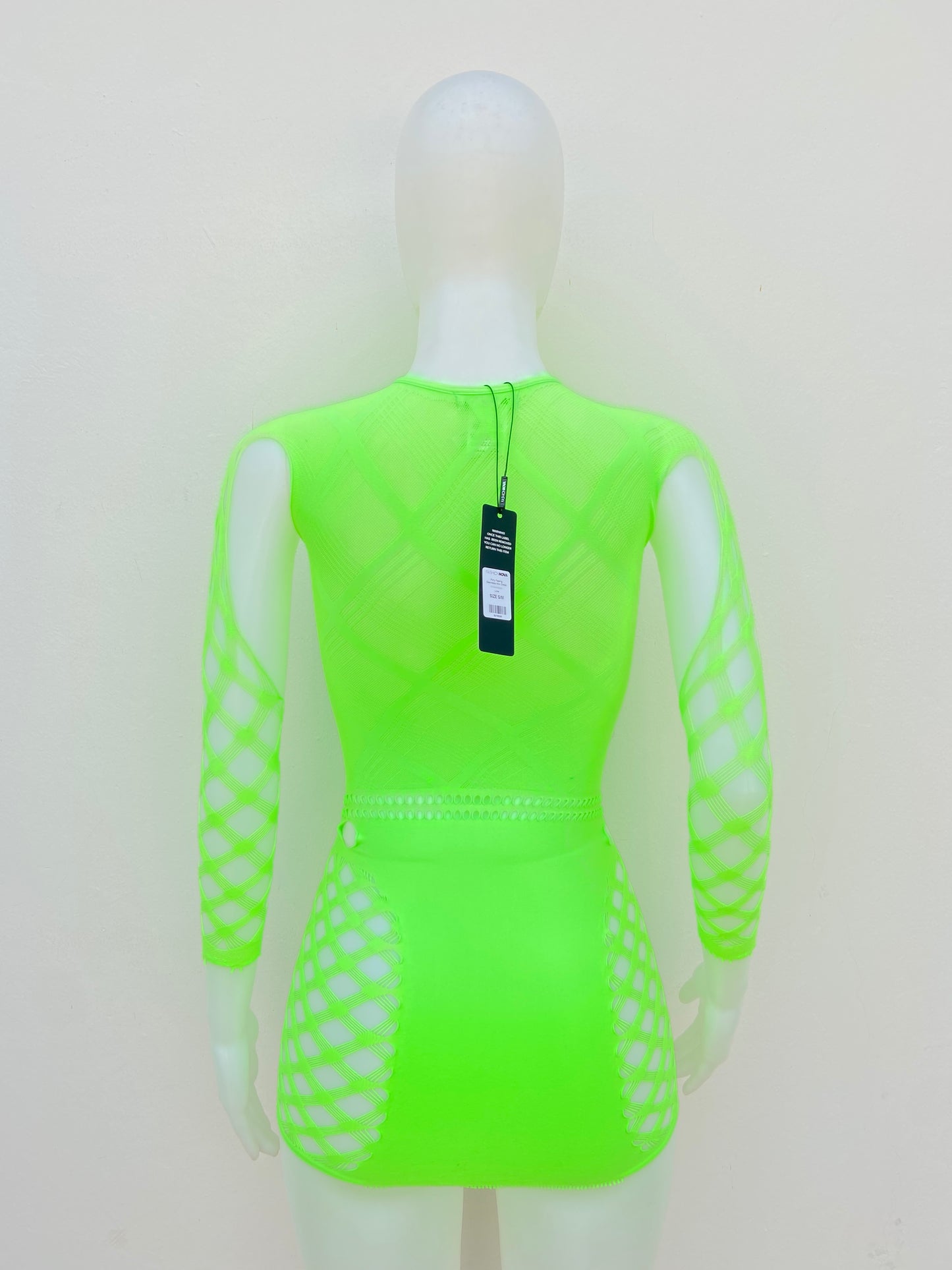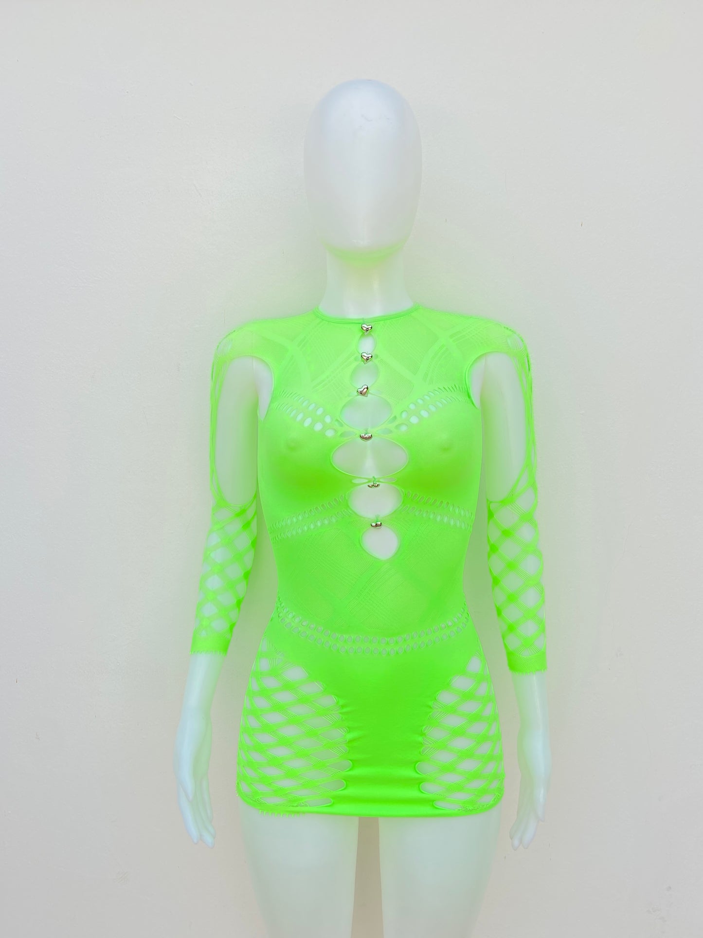Vestido Fashion Nova original verde limon( Neón ) con abiertos y detalles de corazón plateado en frente.