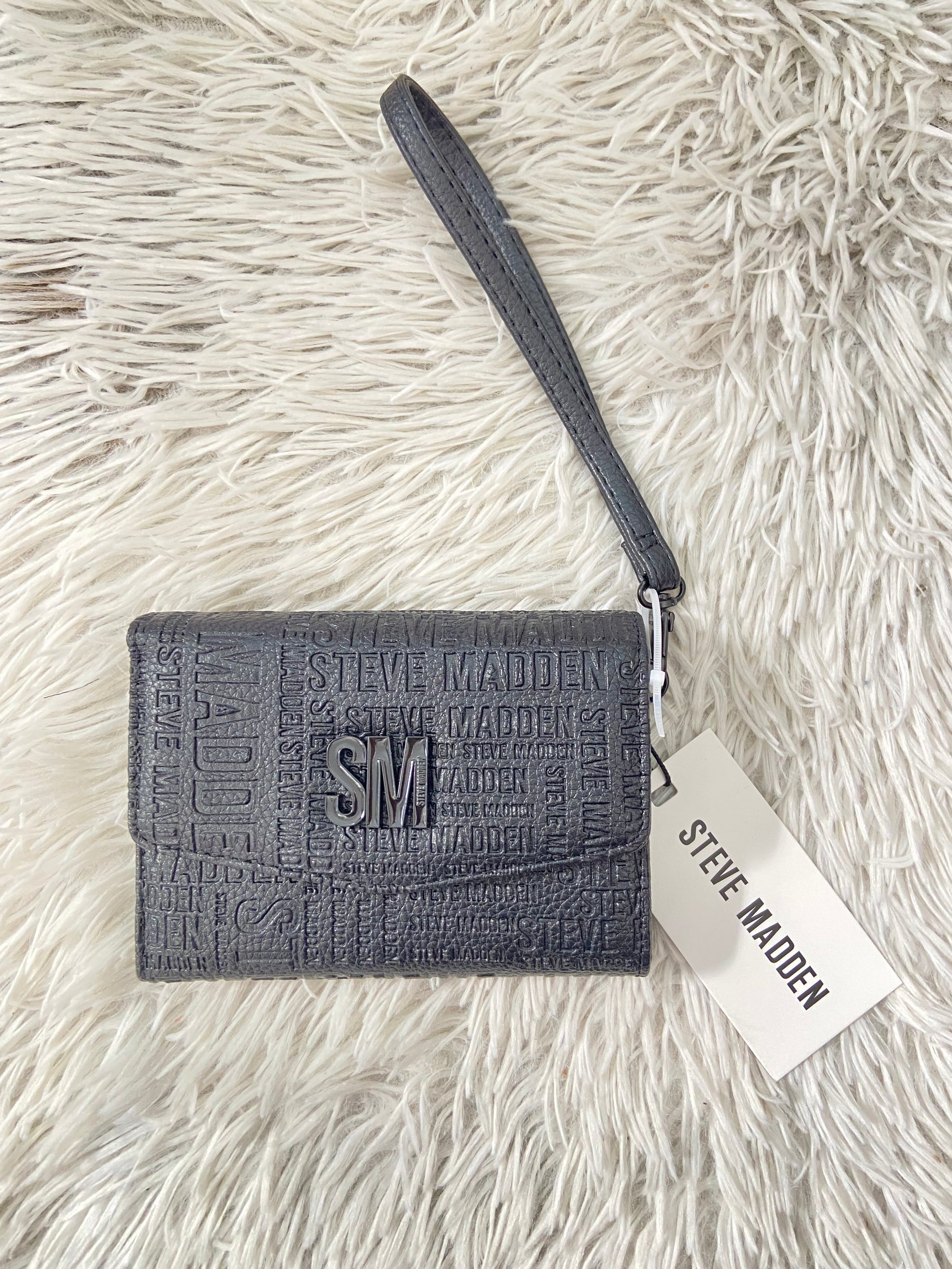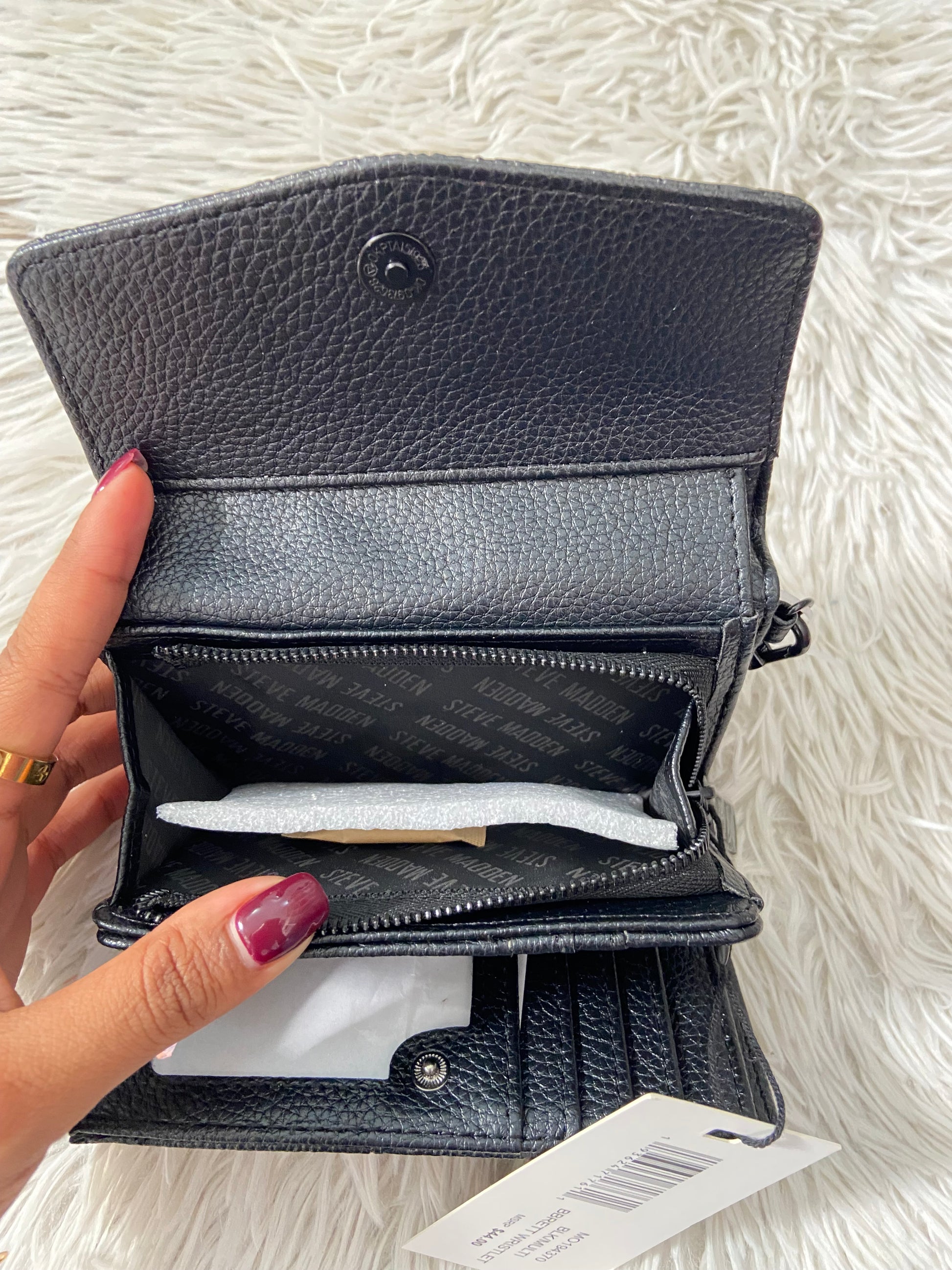 Monedero STEVE MADDEN Original negro con estampado de la marca y placa SM en frente.