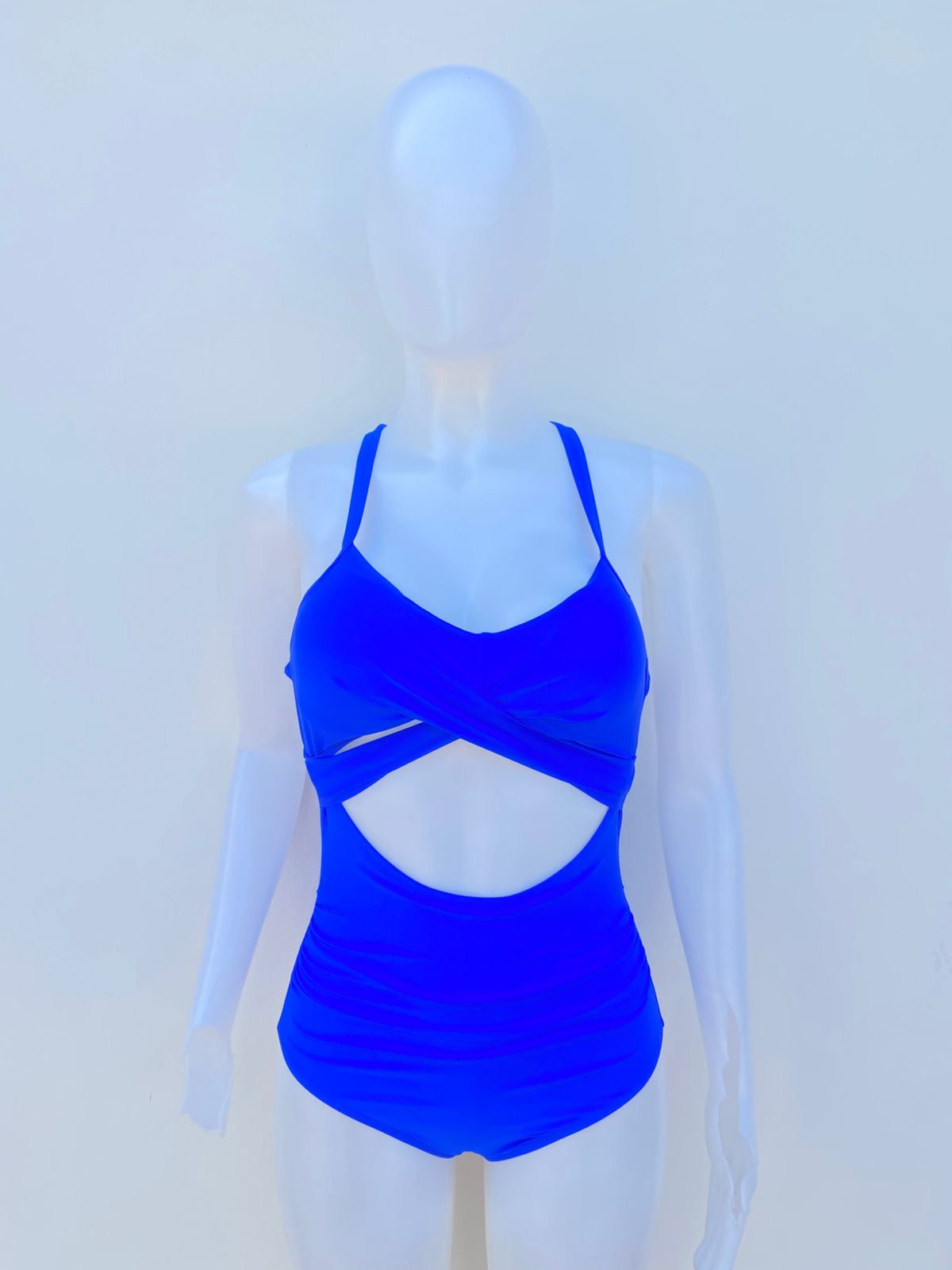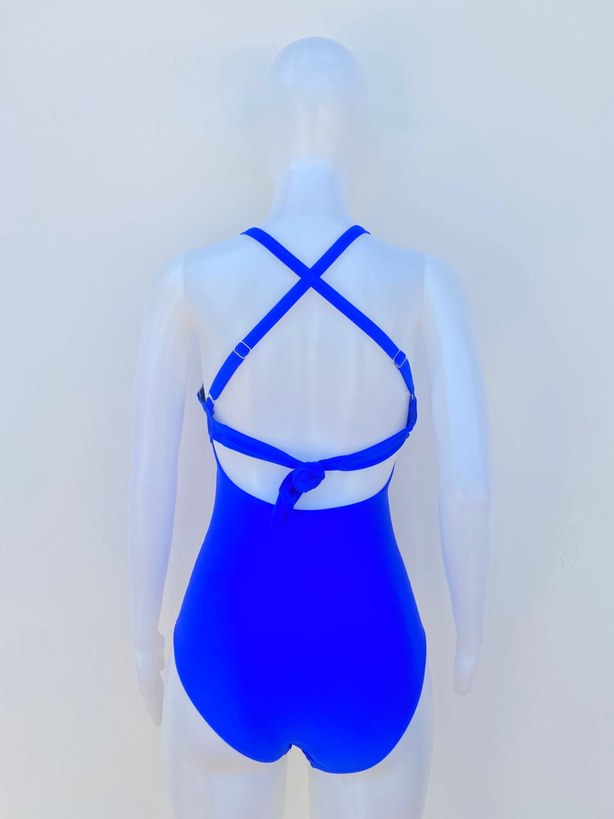 Biquini, azul rey con lazos ajustables en la parte delantera y esconde en frente, una piezas.