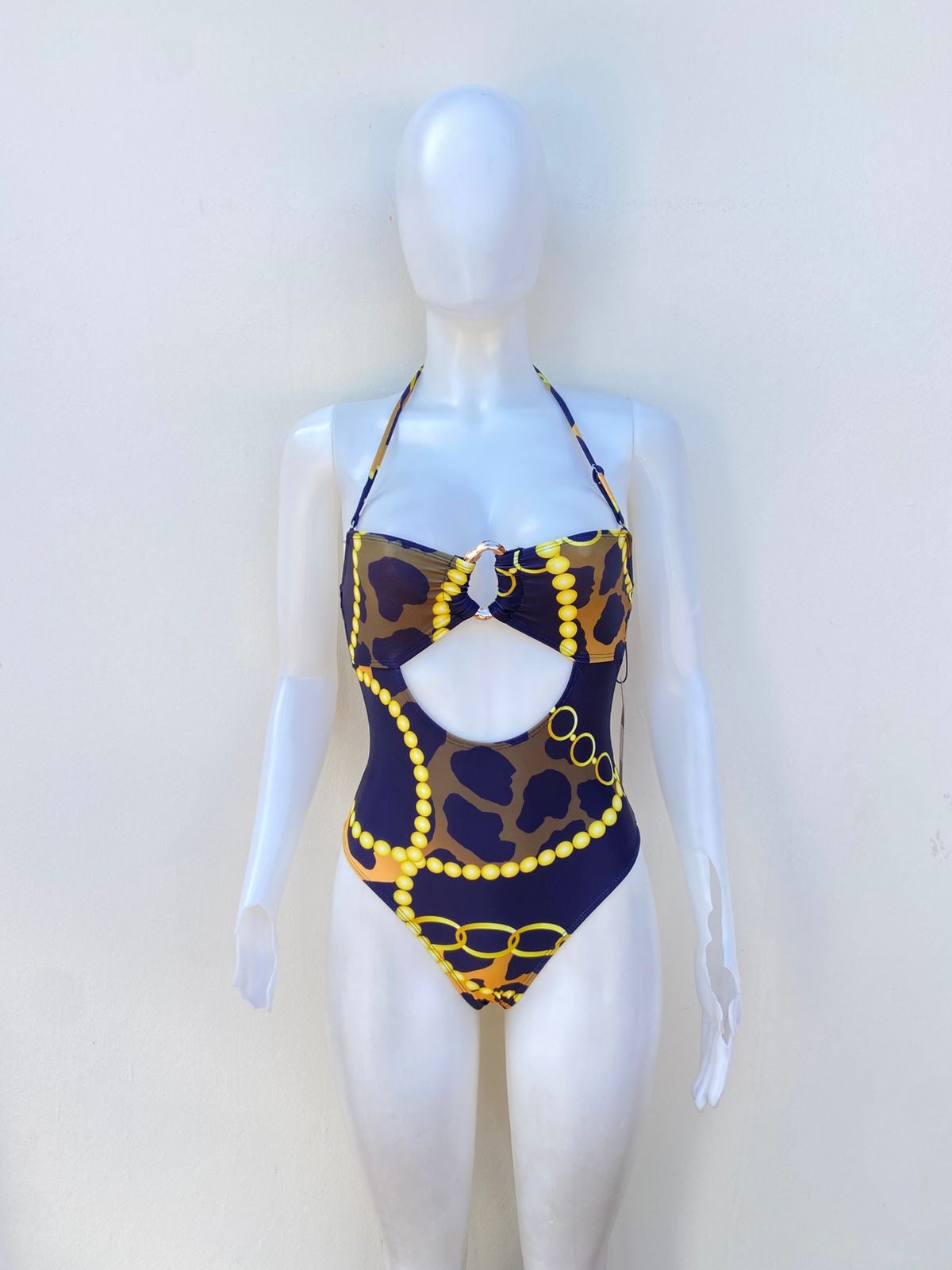 Biquini, negro con estampado de animal printe en amarillo y naranja, una pieza.