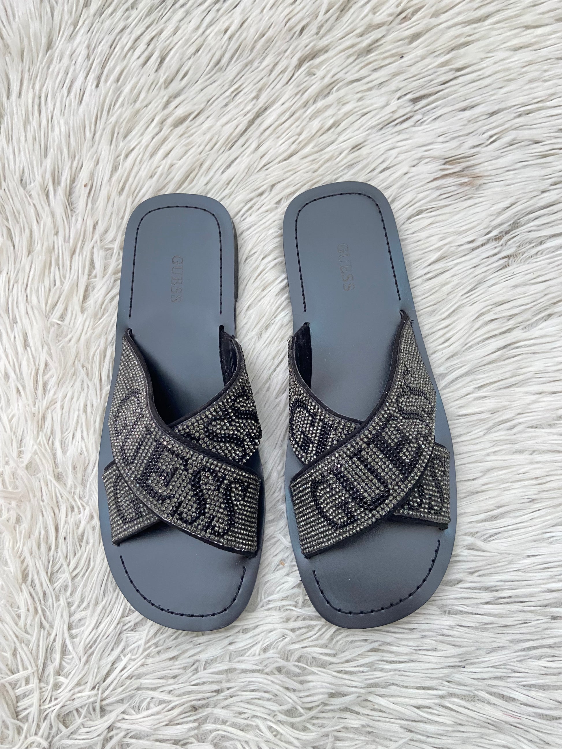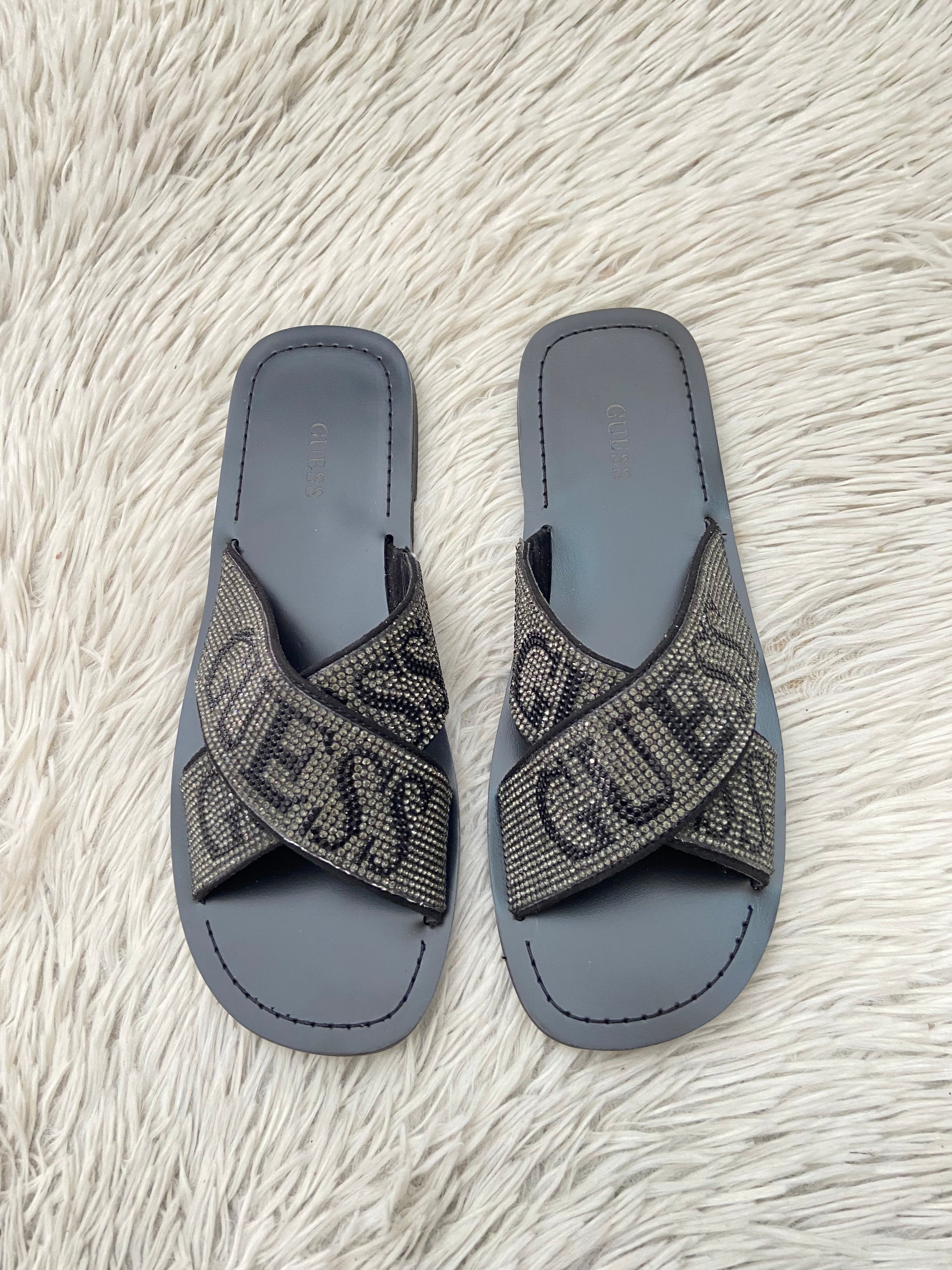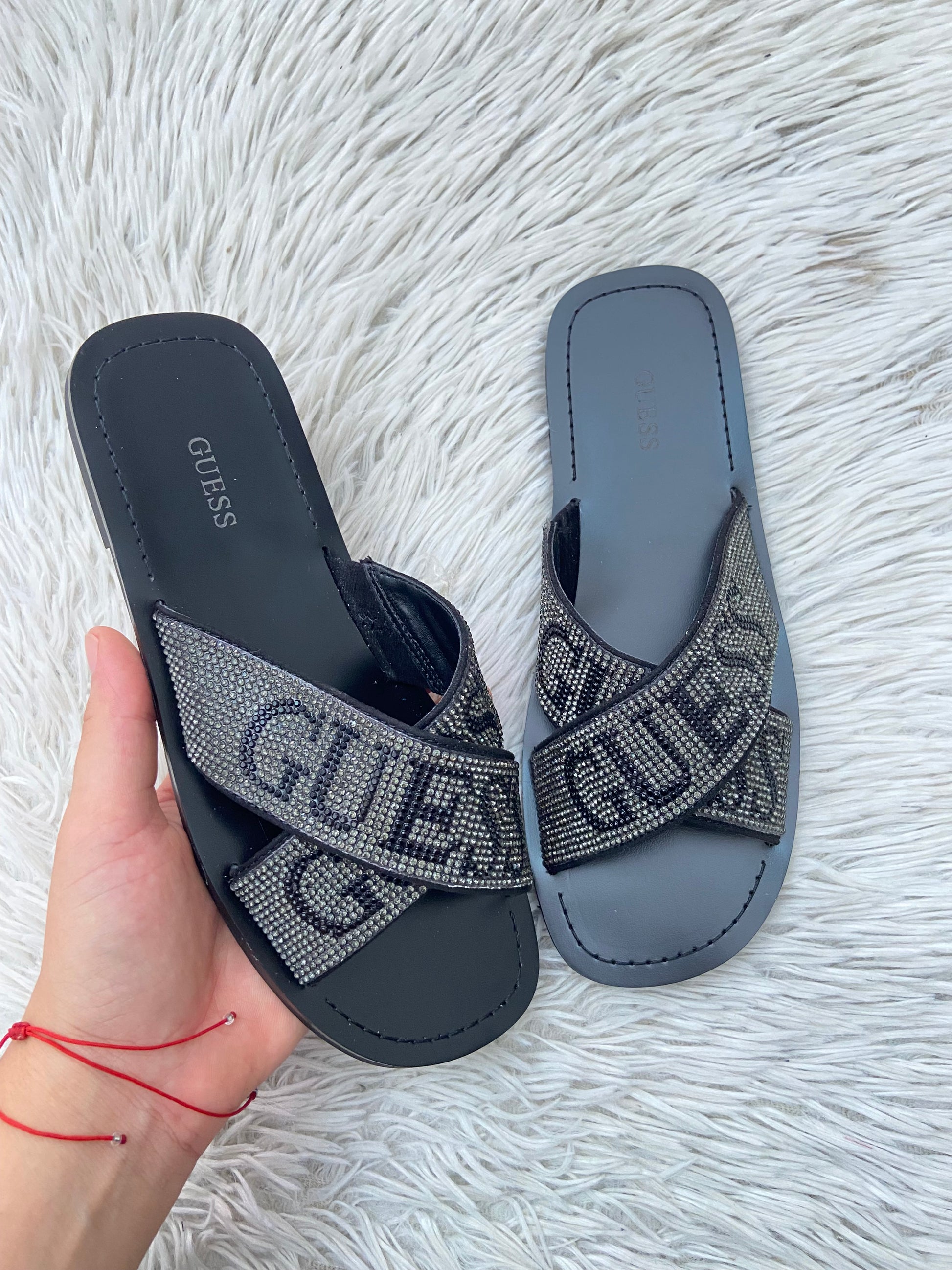 Sandalias GUESS original negra con brillos en la parte delantera y letras GUESS.