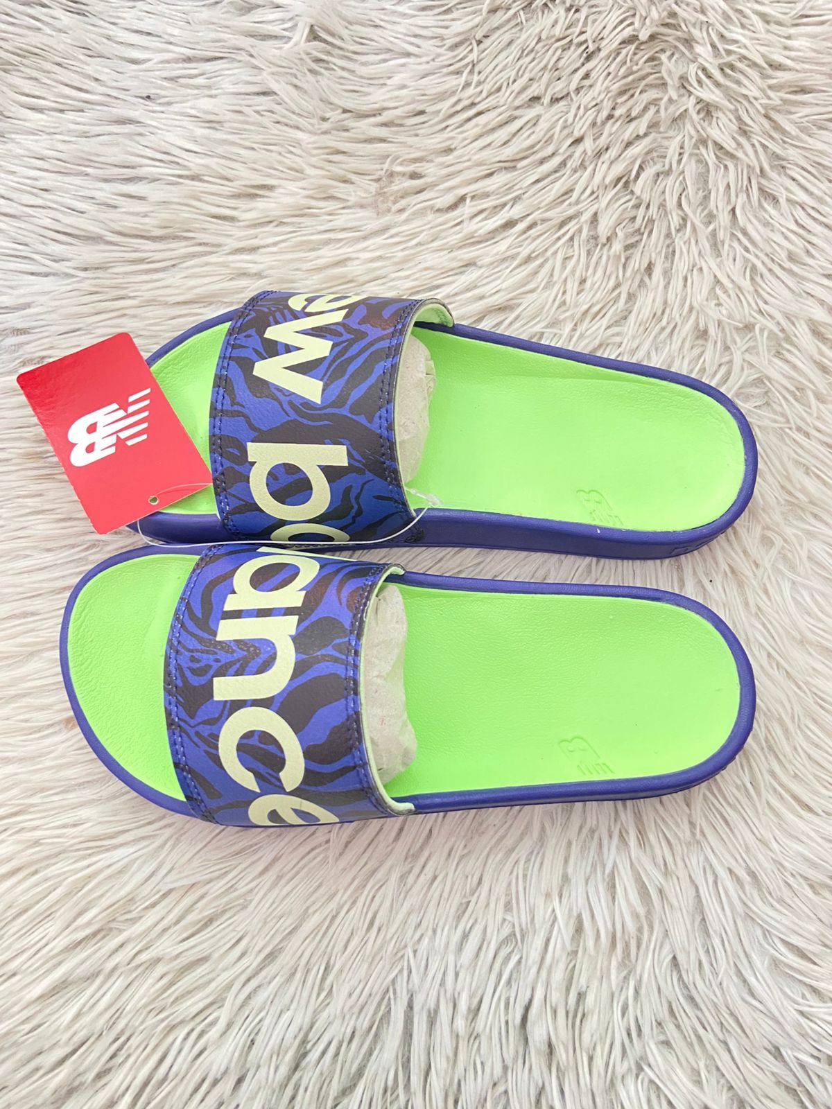 Sandalias NEW BALANCE original azul marino con verde neón y letras de la marca en frente.