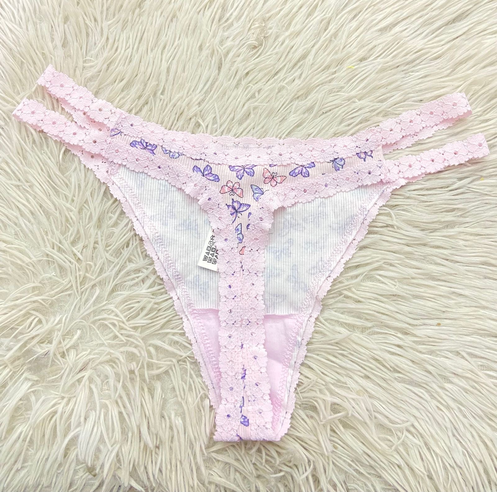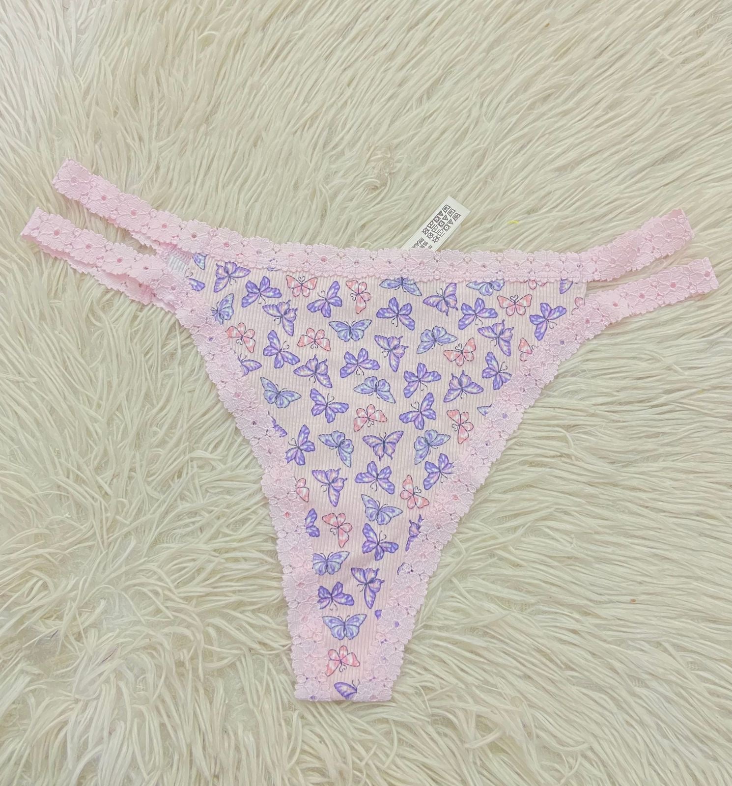 Panti PINK original rosado en encaje con estampado de mariposas moradas.