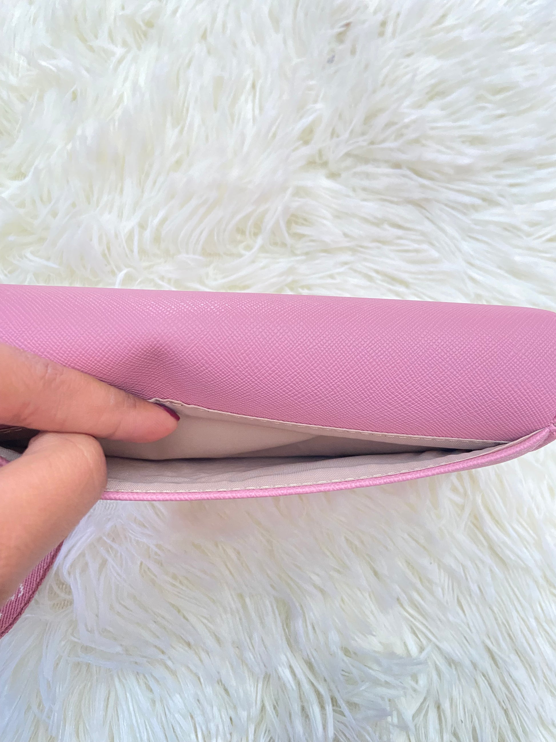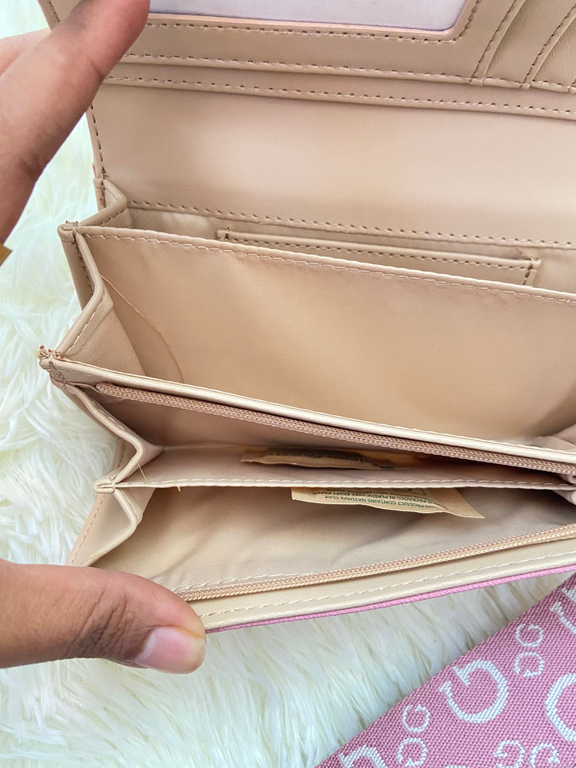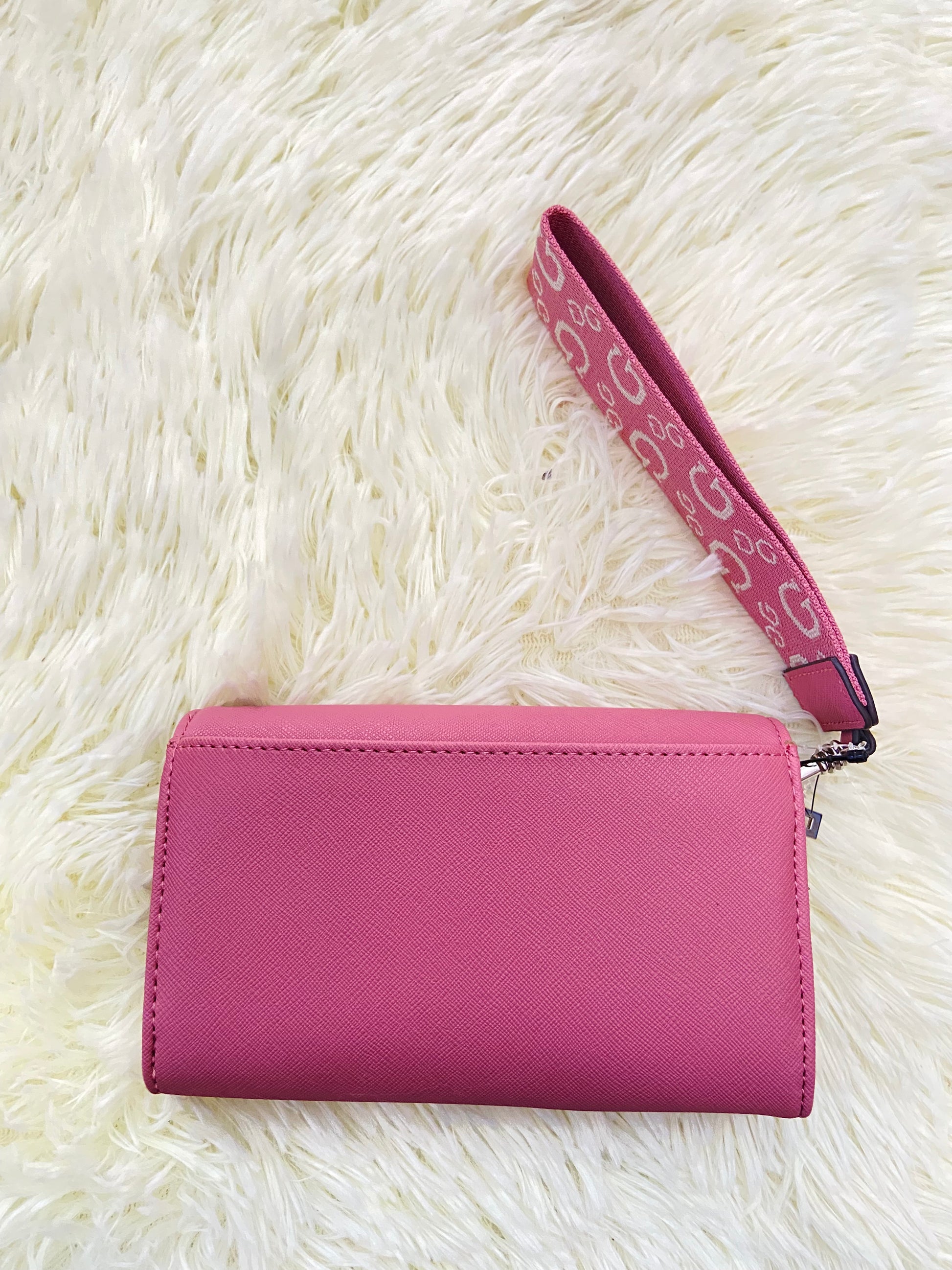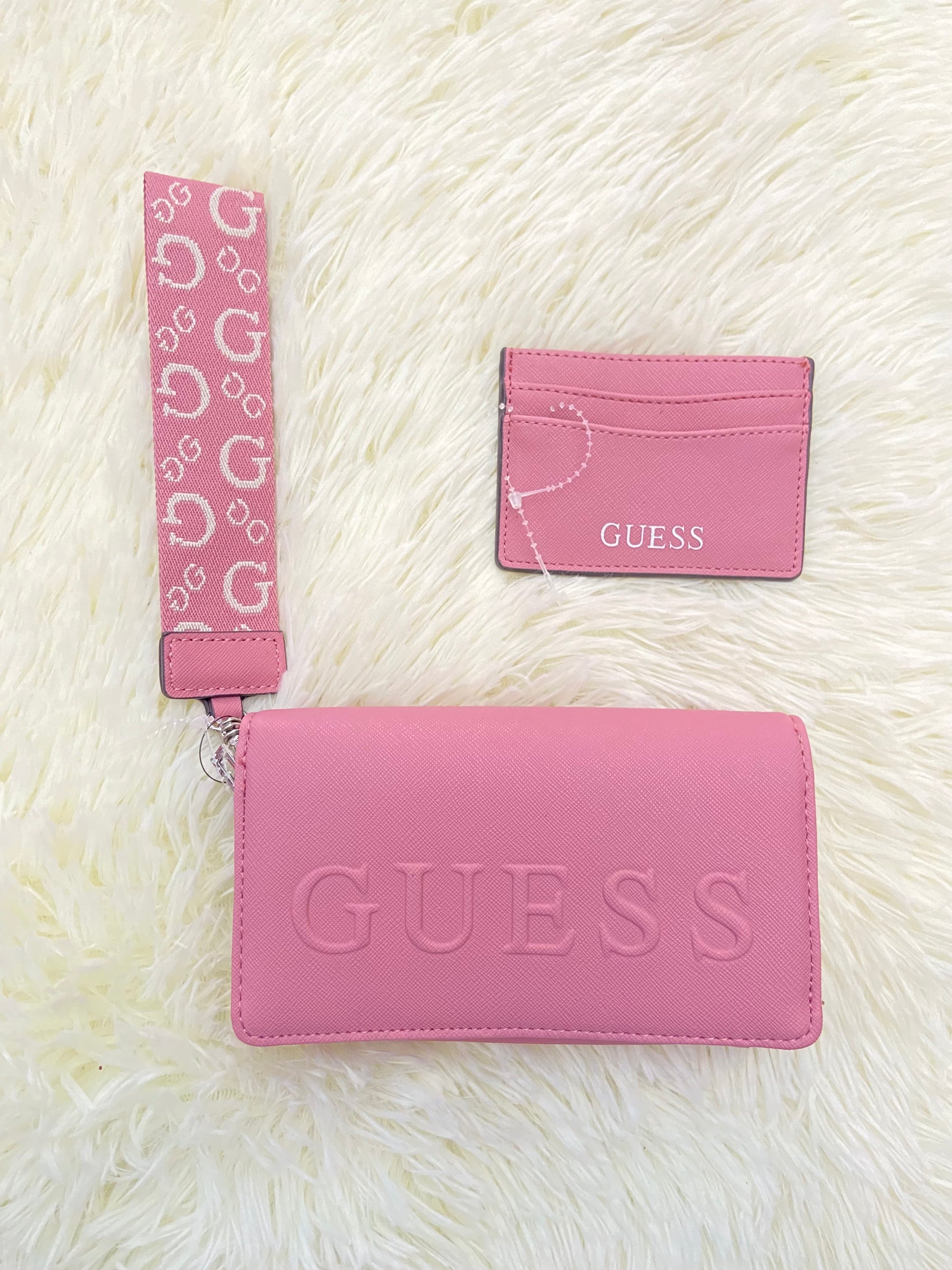 Set GUESS original de monedero/ cartera y tarjetero de color rosado ( Dusty Rose ) con letras de color plateado y rosado.