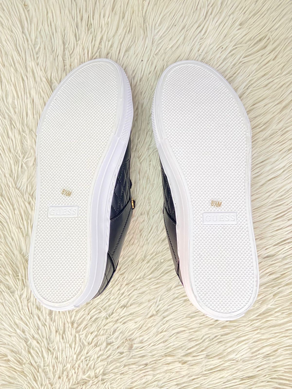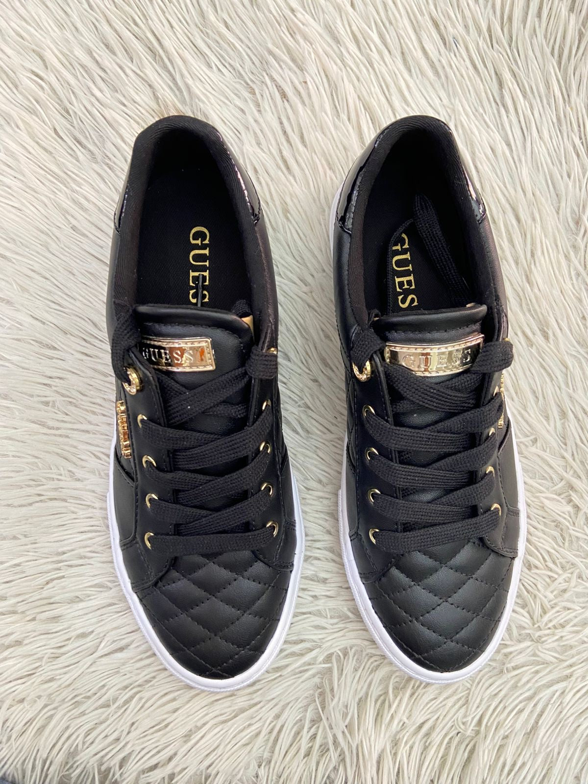 Tenis GUESS Original en color negro con detalles dorados y placa de la marca al lado en dorado.