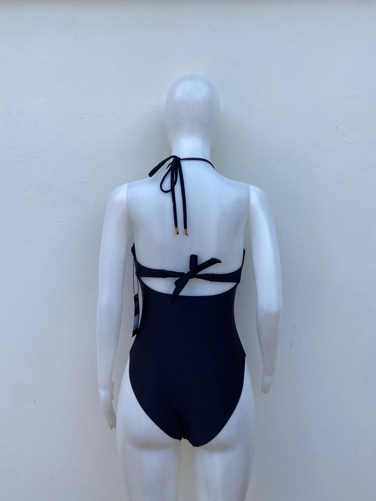Biquini, negro liso con placa en medio en forma de corazón y lazos ajustables.