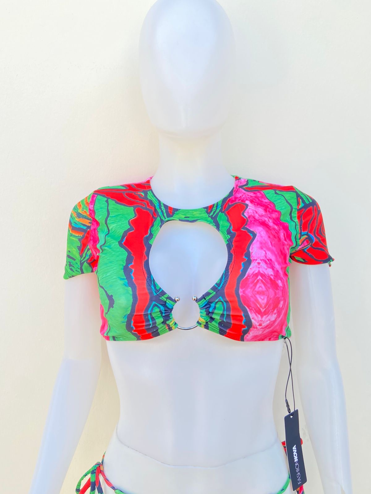 Biquini, rosado con verde y estampado de animal print y lazos ajustables, dos piezas.