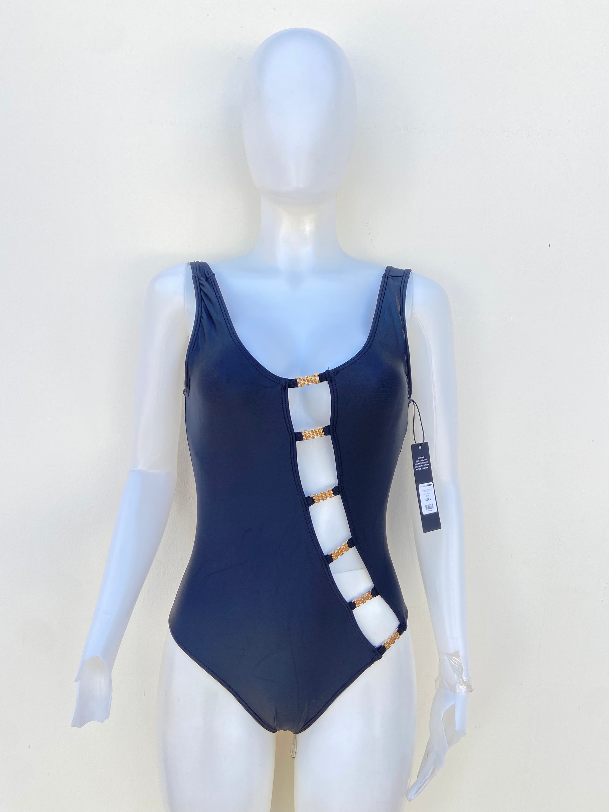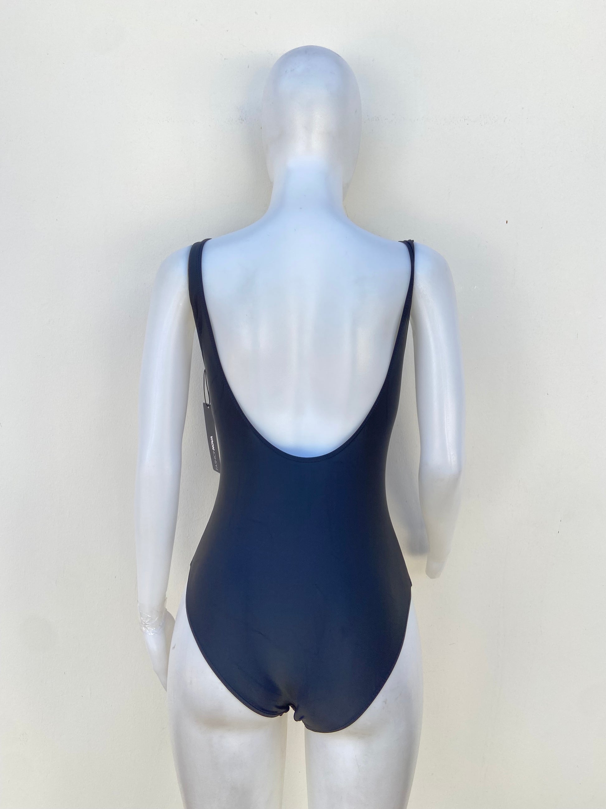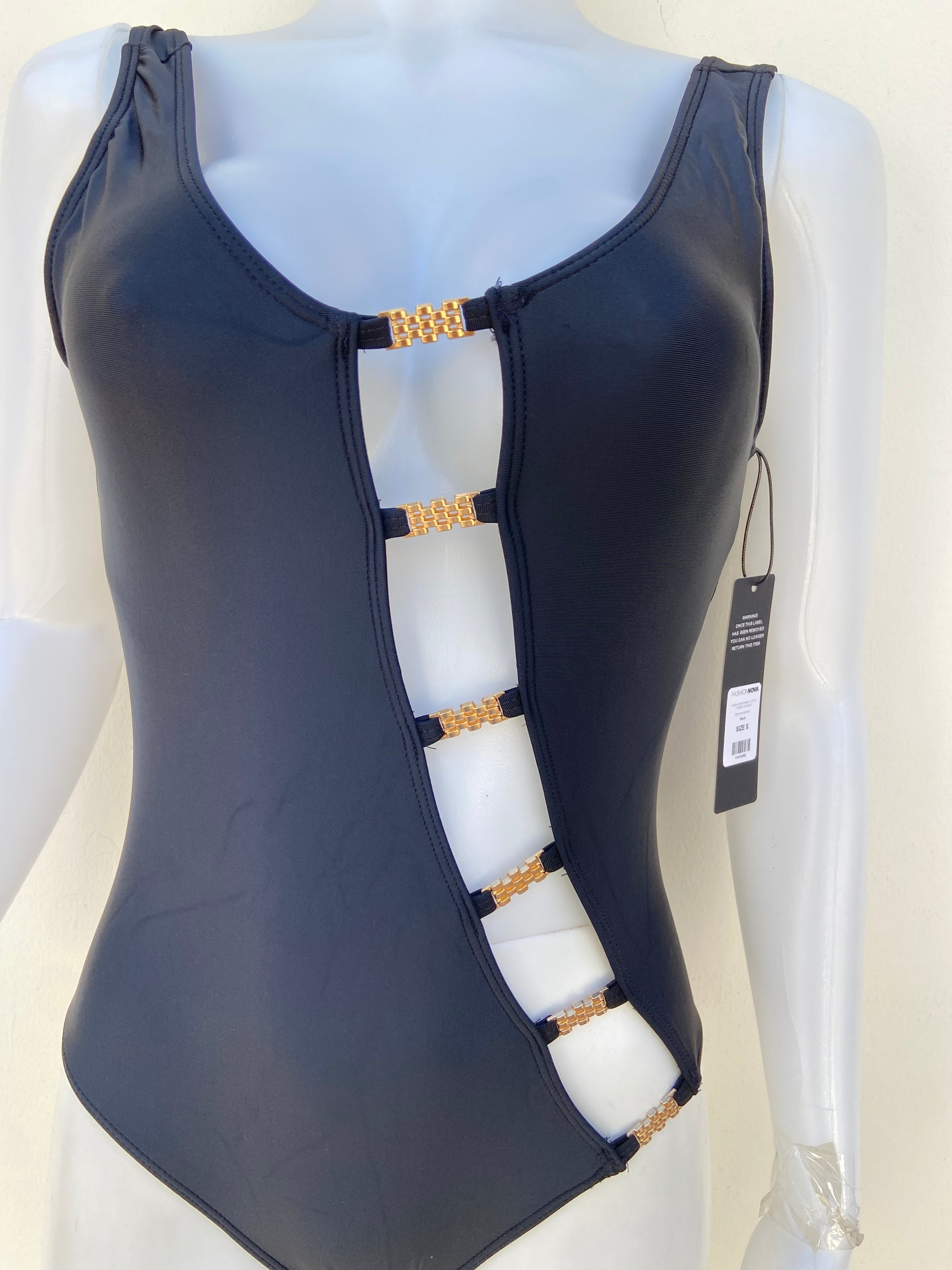 Biquini, negro con abierto en los lados y escote en la espalda.