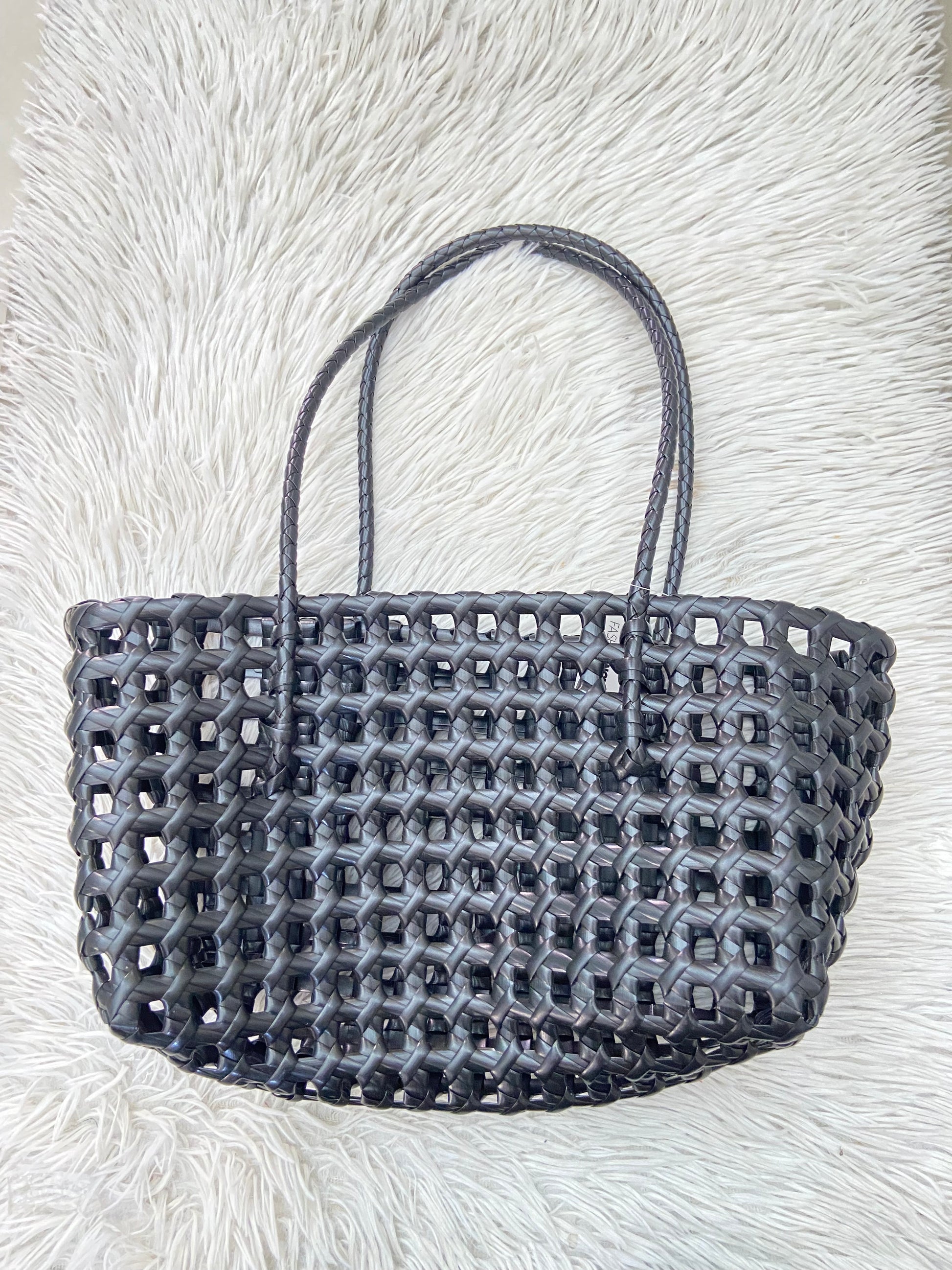 Cartera, negra estilo de muchos cuadros, abiertas.