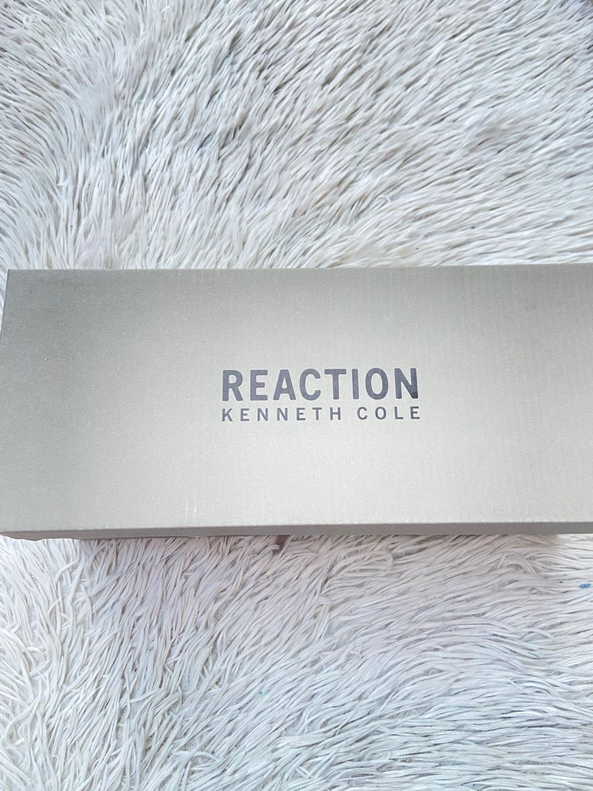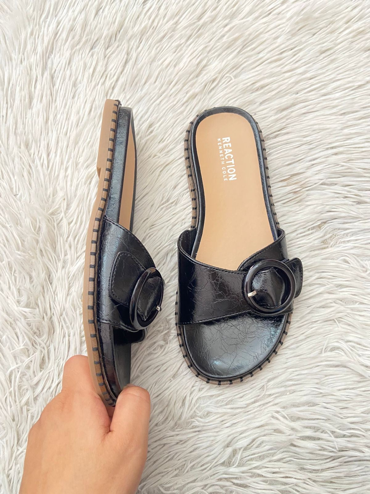Sandalias KENNETH COLE REACTION Original, en color negra con fondo beige y detalle de evilla circular al frente