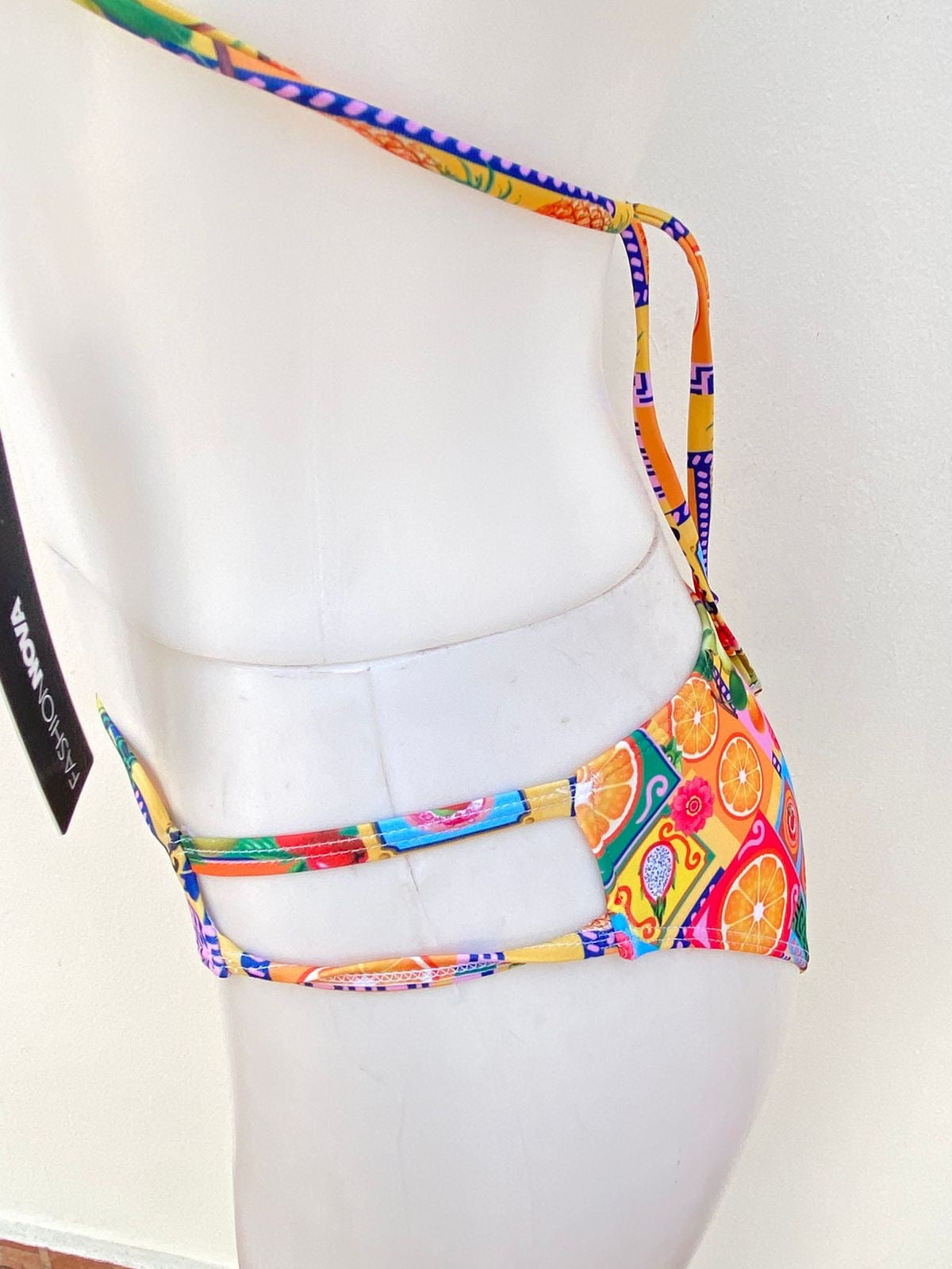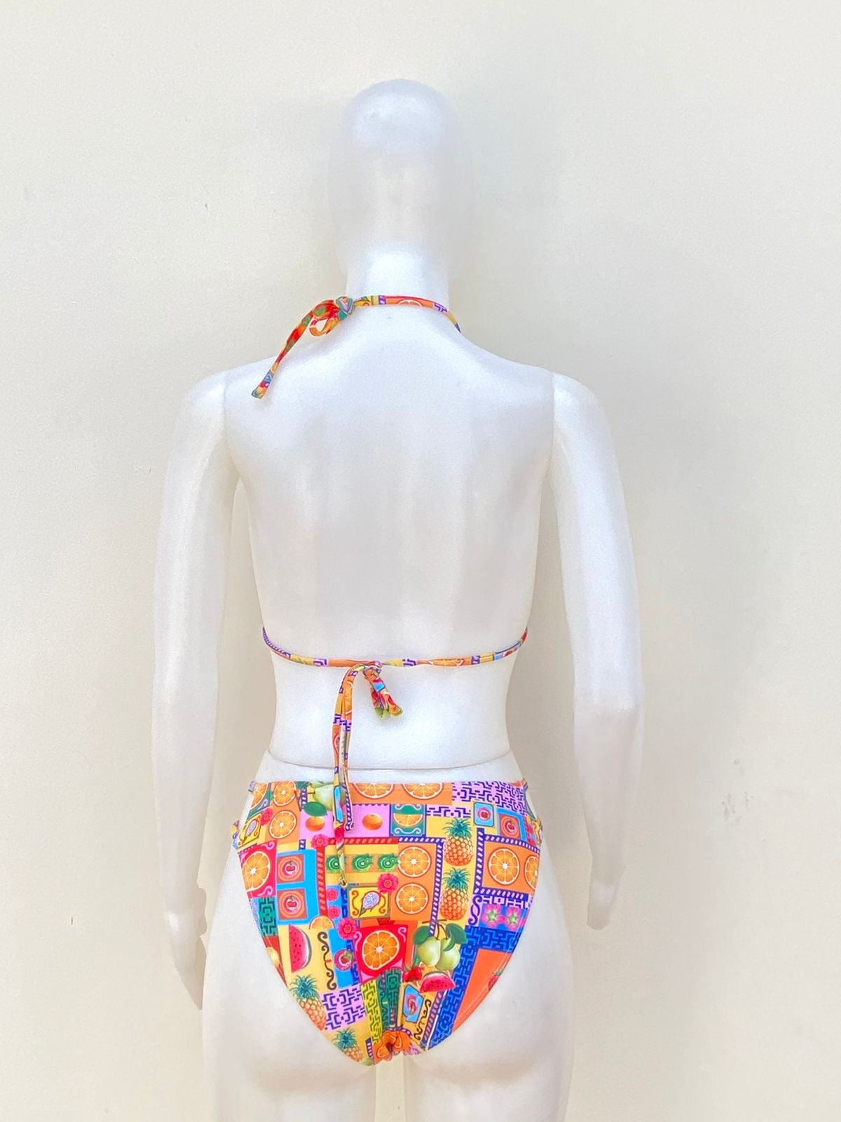 Biquini, naranja con estampado de frutas y lazos ajustables, dos piezas.