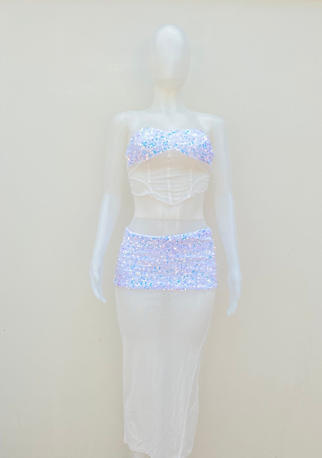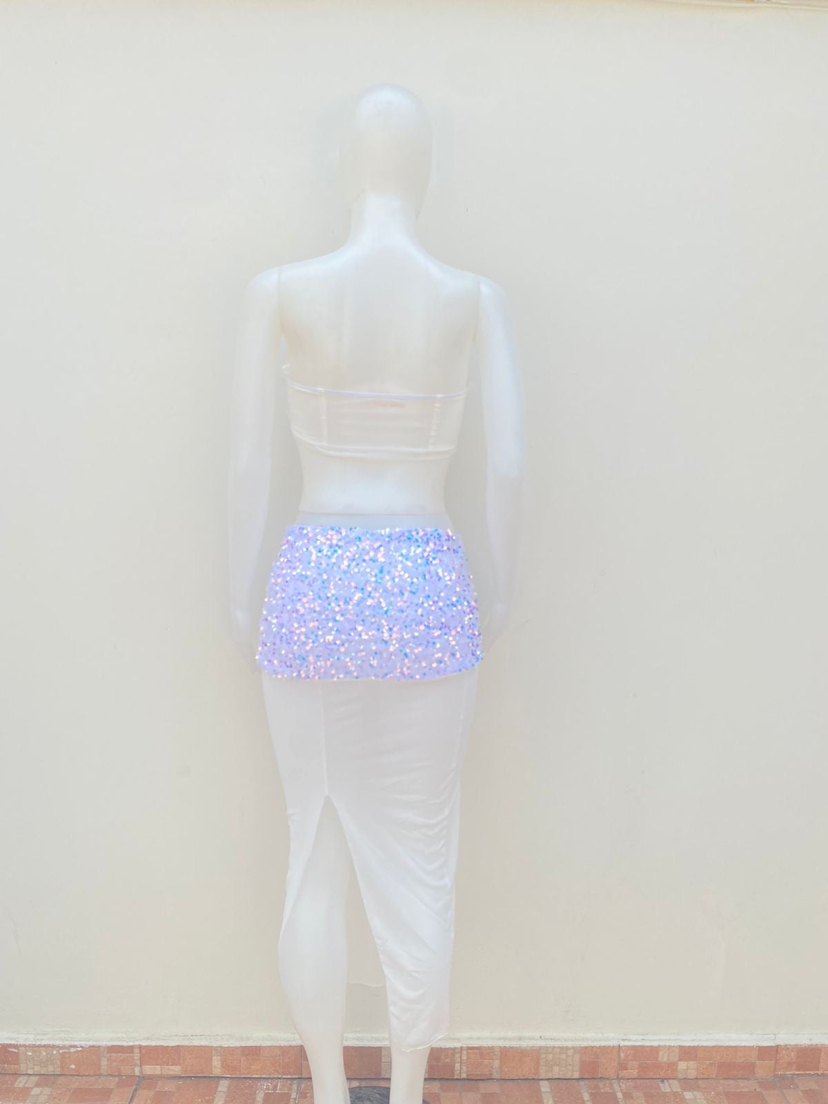 Conjunto NEW PINK original blanco con lentejuelas en colores azules.