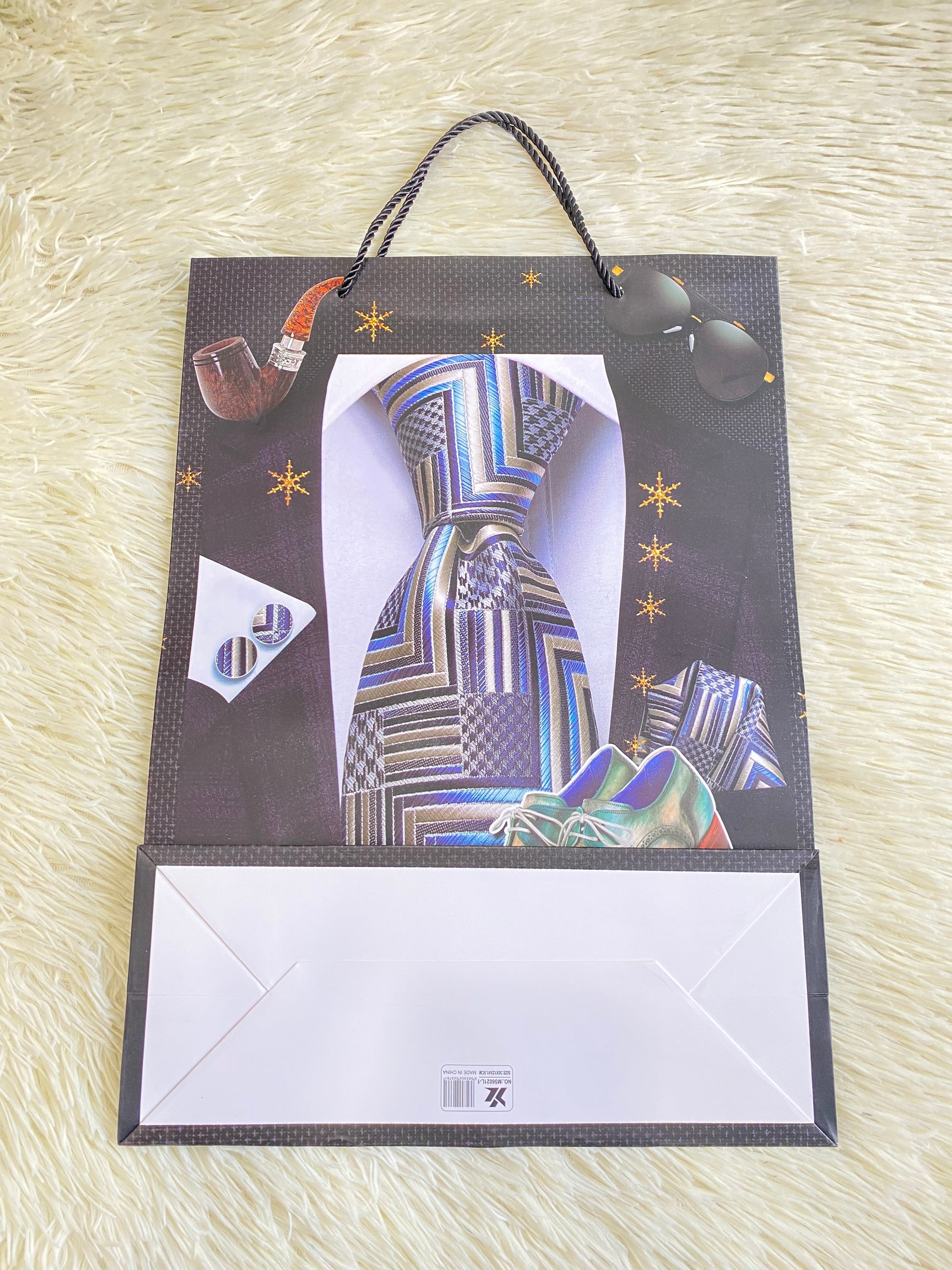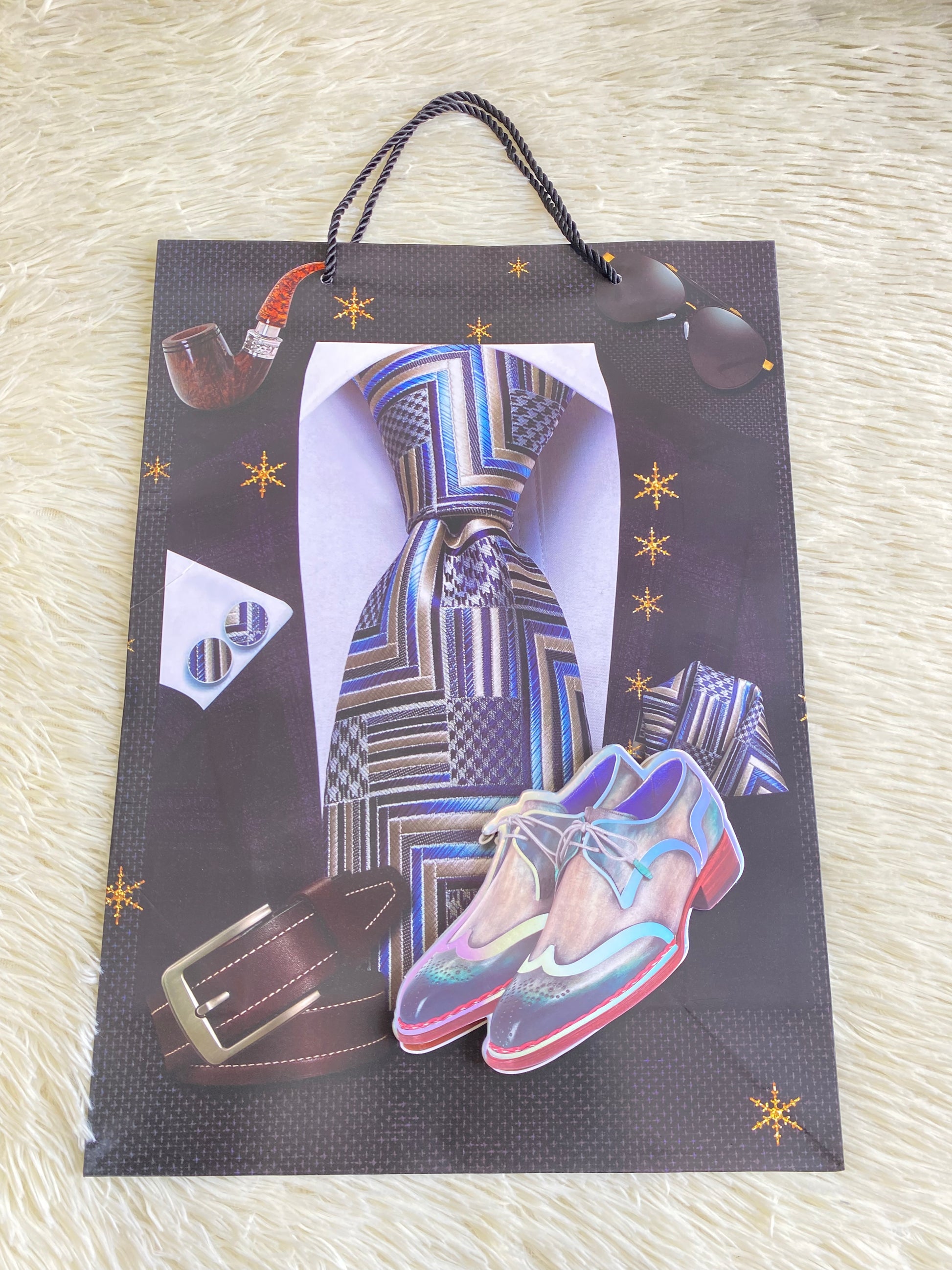 Shopping negro con corbata azul y zapatos gris en el centro. GRANDE