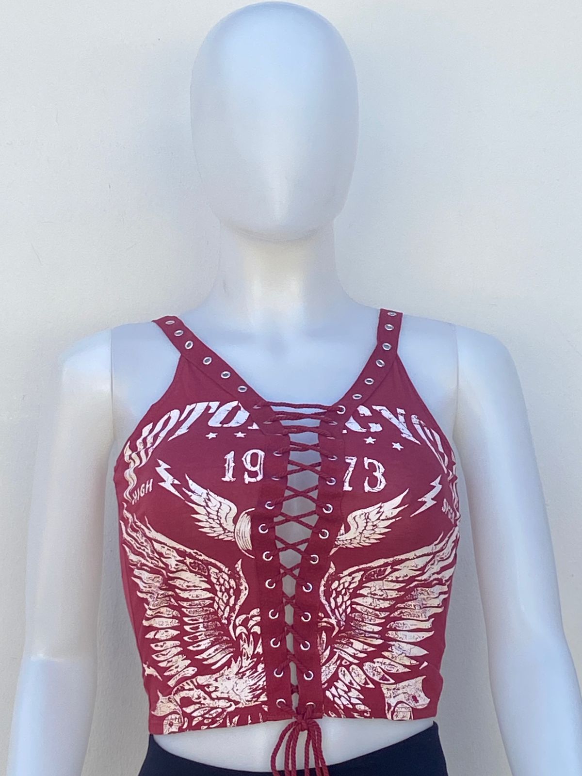 Top, rojo vino, con estampado de alas en color blanco y lazos ajustables.