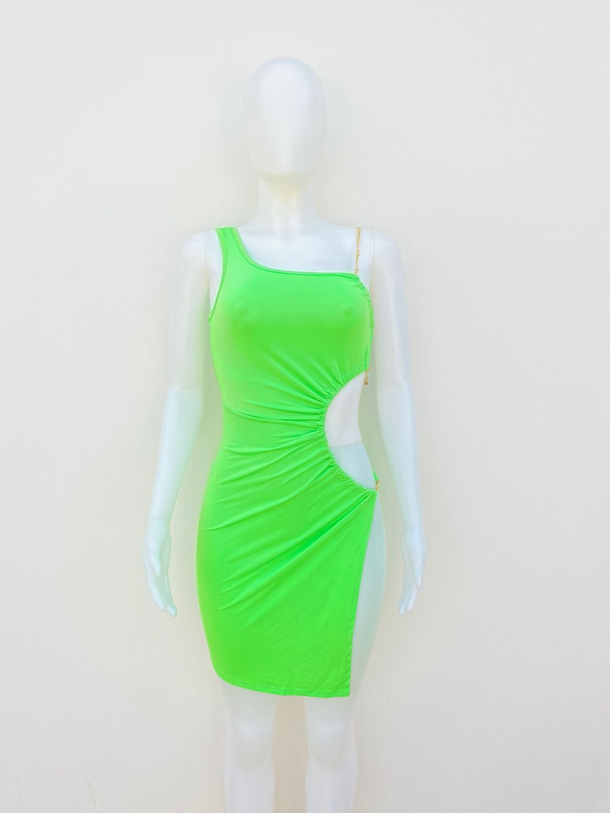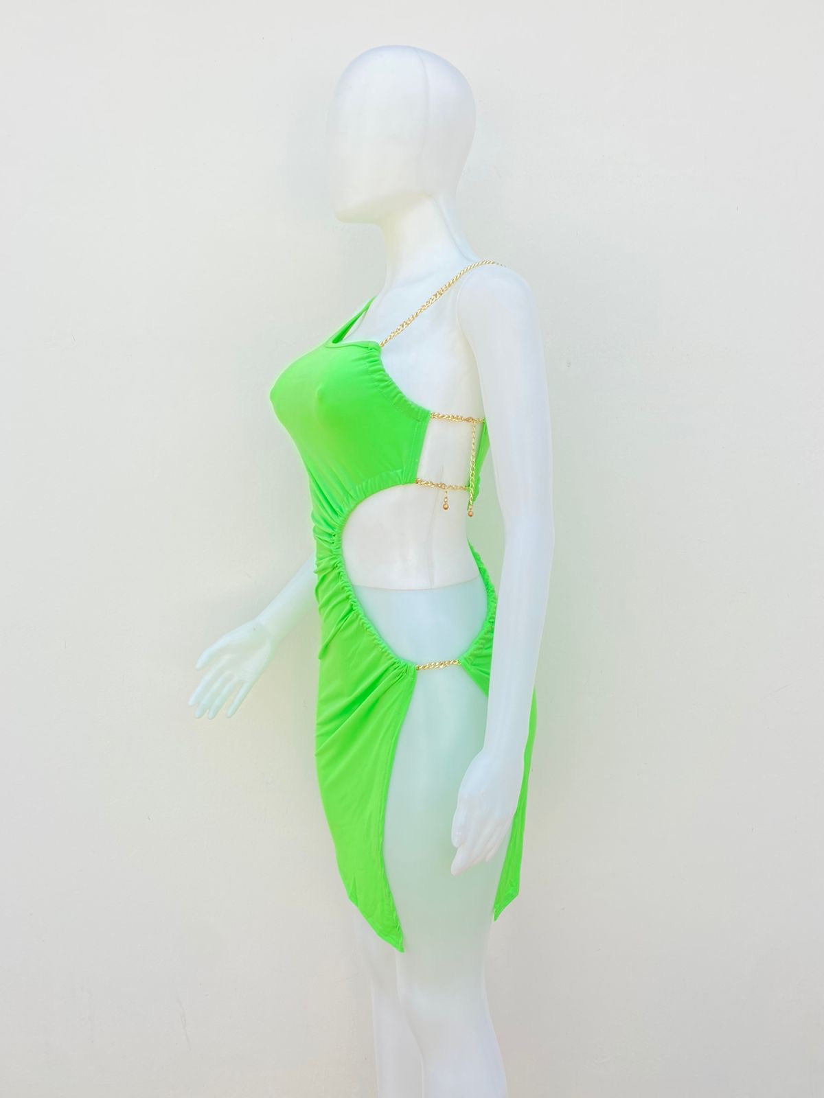 Vestido Fashion Nova original verde con abierto en los lados y cadena dorada.