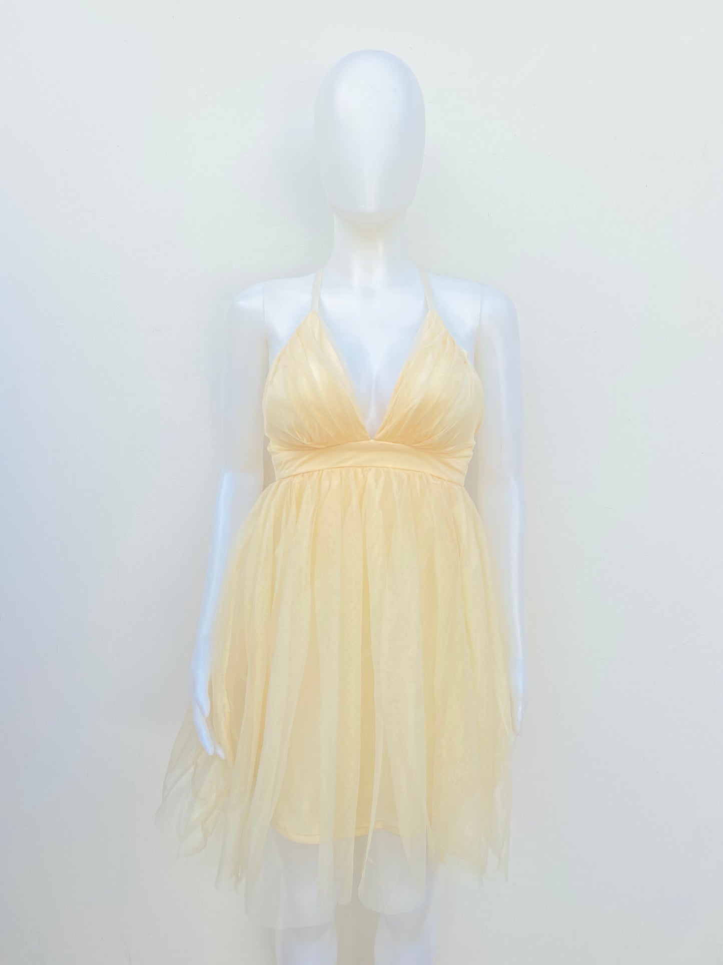 Vestido Haute Monde original amarillo claro con vuelos.
