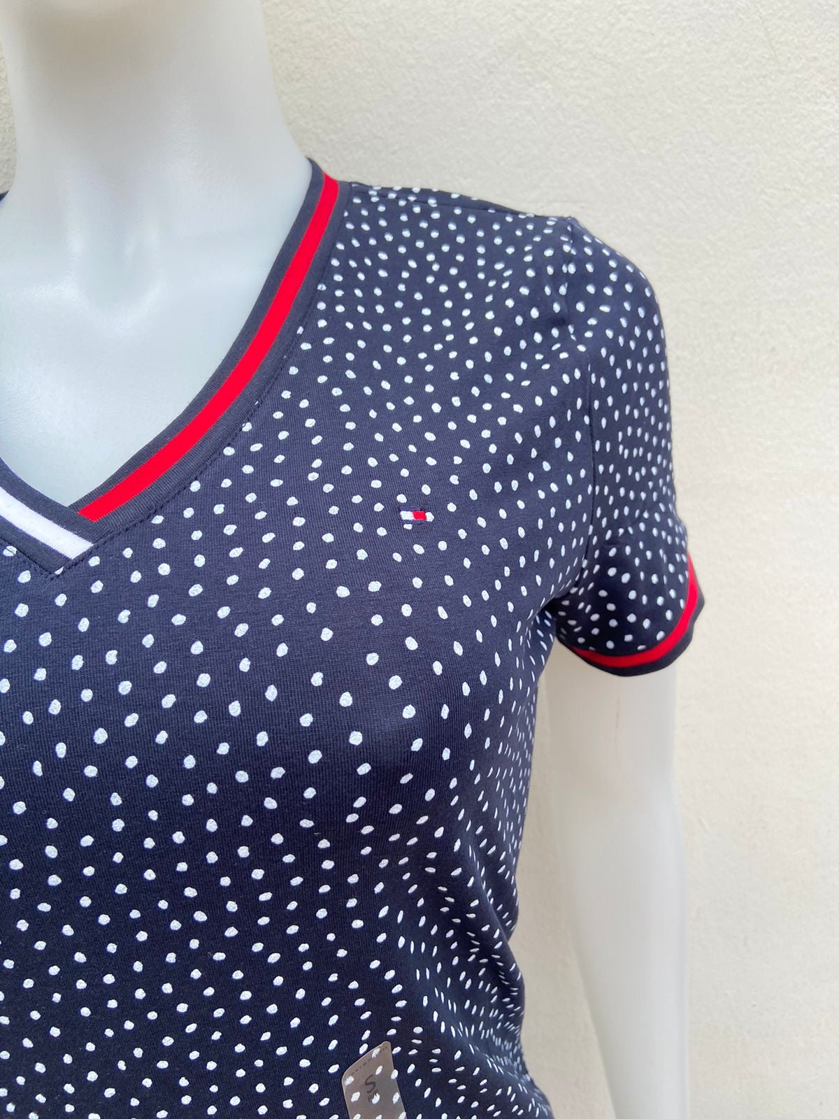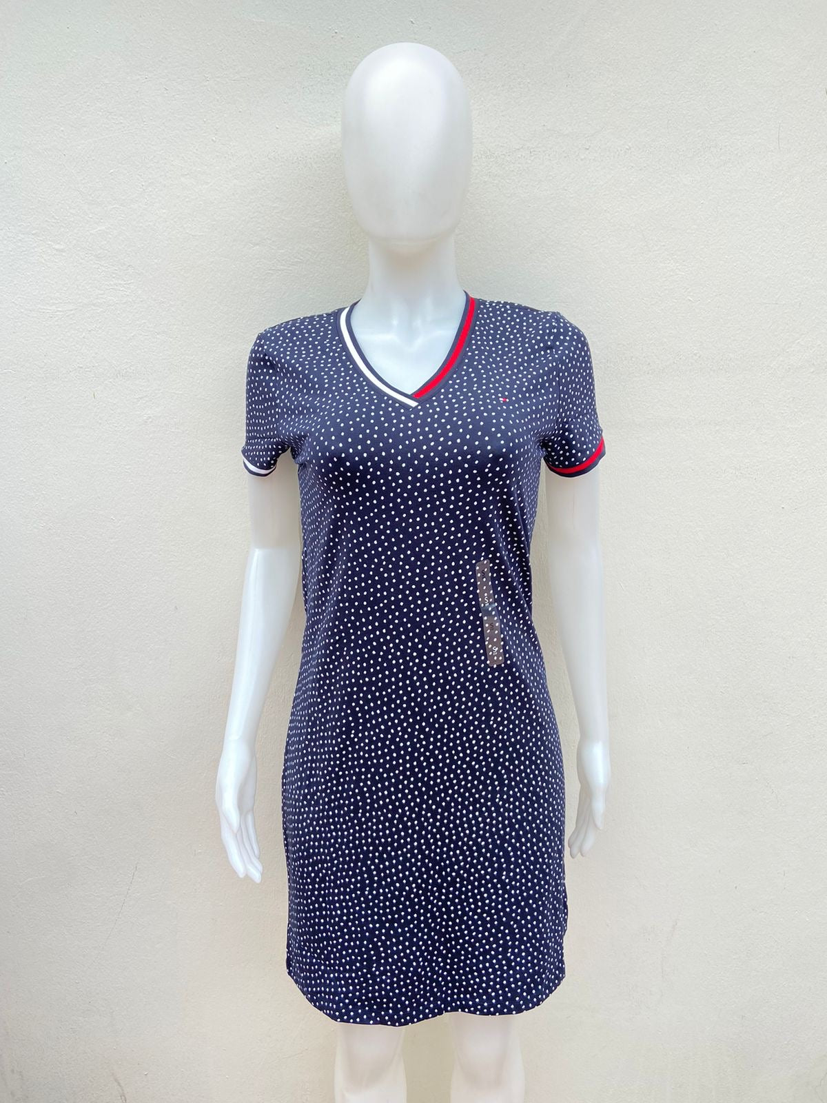 Vestido Tommy Hilfiger original azul marino con estampado de bolitas y cuello V.